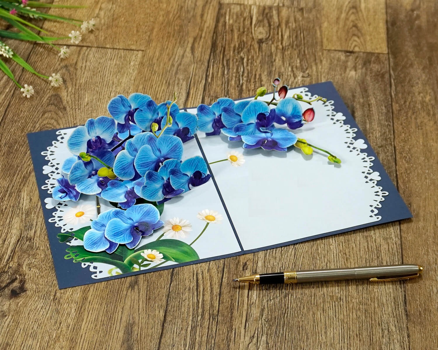 Tặng một món quà tinh tế và sang trọng với thiệp 3D Pop Up hoa lan xanh. Khi mở ra, những cánh hoa lan xanh biếc bật nổi mềm mại và sống động, tượng trưng