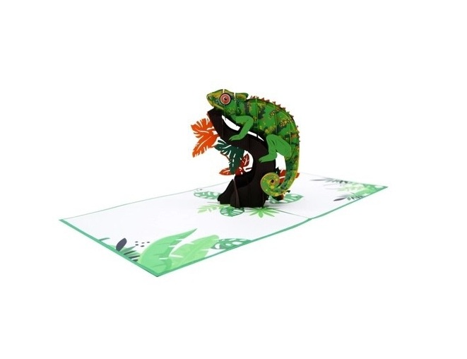 Thiệp 3D tắc kè hoa mang đến trải nghiệm bất ngờ với hình ảnh chú tắc kè đầy màu sắc leo trên cành cây khi mở ra. Thiết kế sống động, chi tiết tinh xảo khiến tấm thiệp trở thành một món quà thú vị và độc lạ, phù hợp cho cả trẻ em lẫn người lớn yêu thích thiên nhiên, động vật.