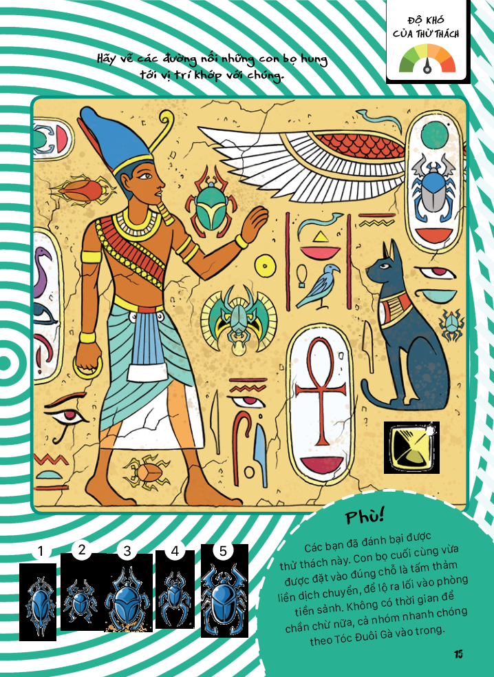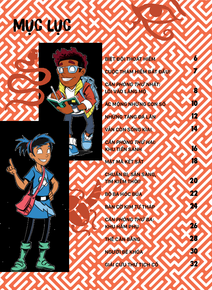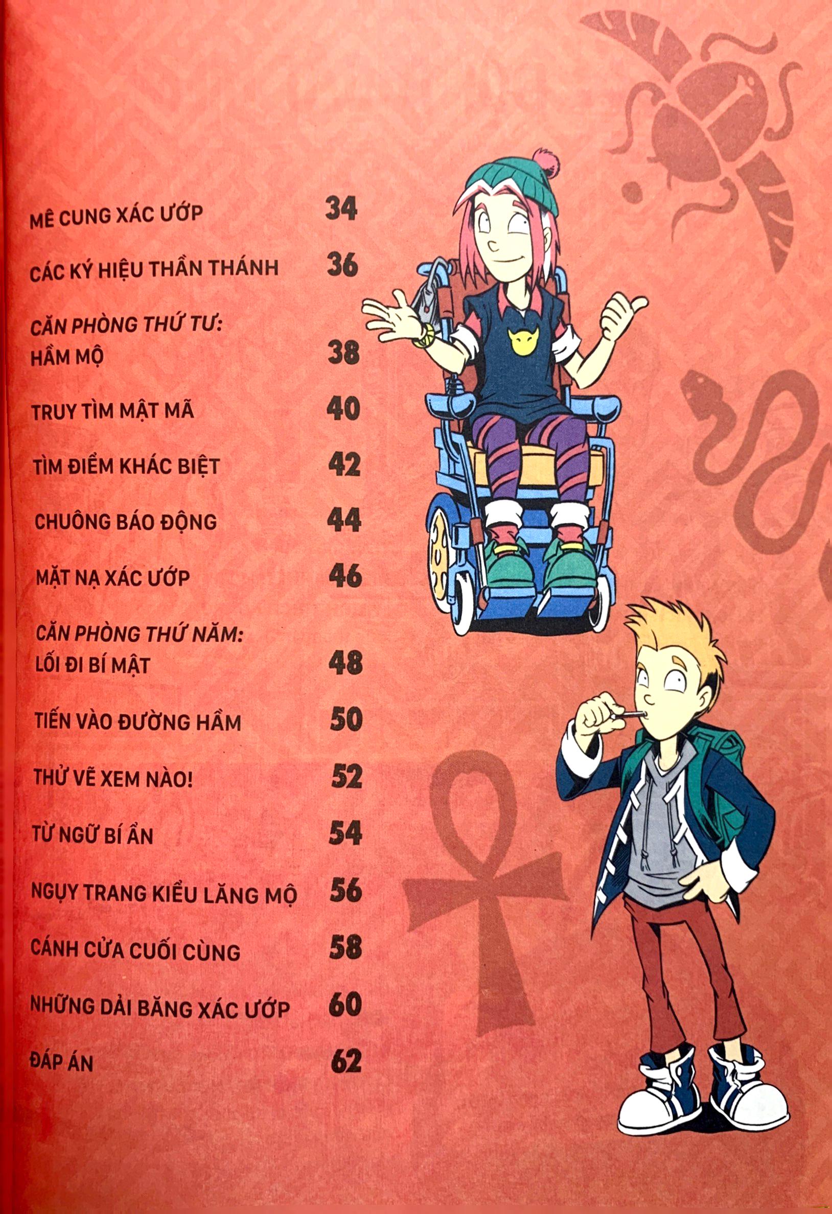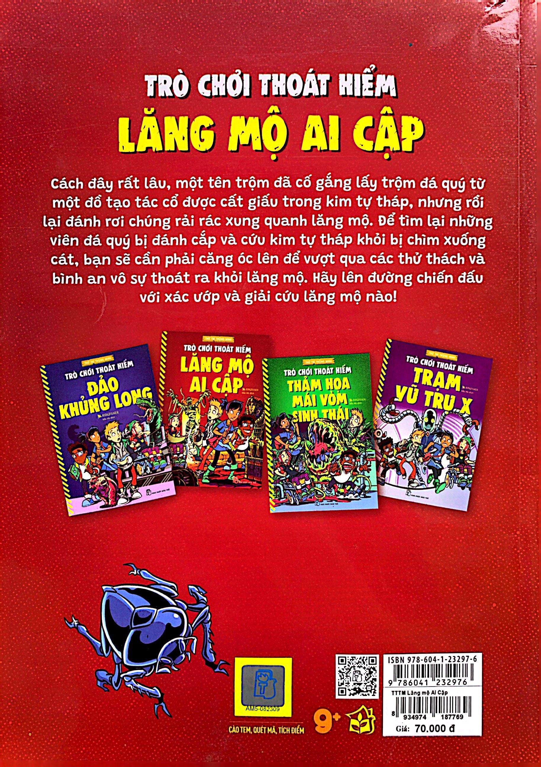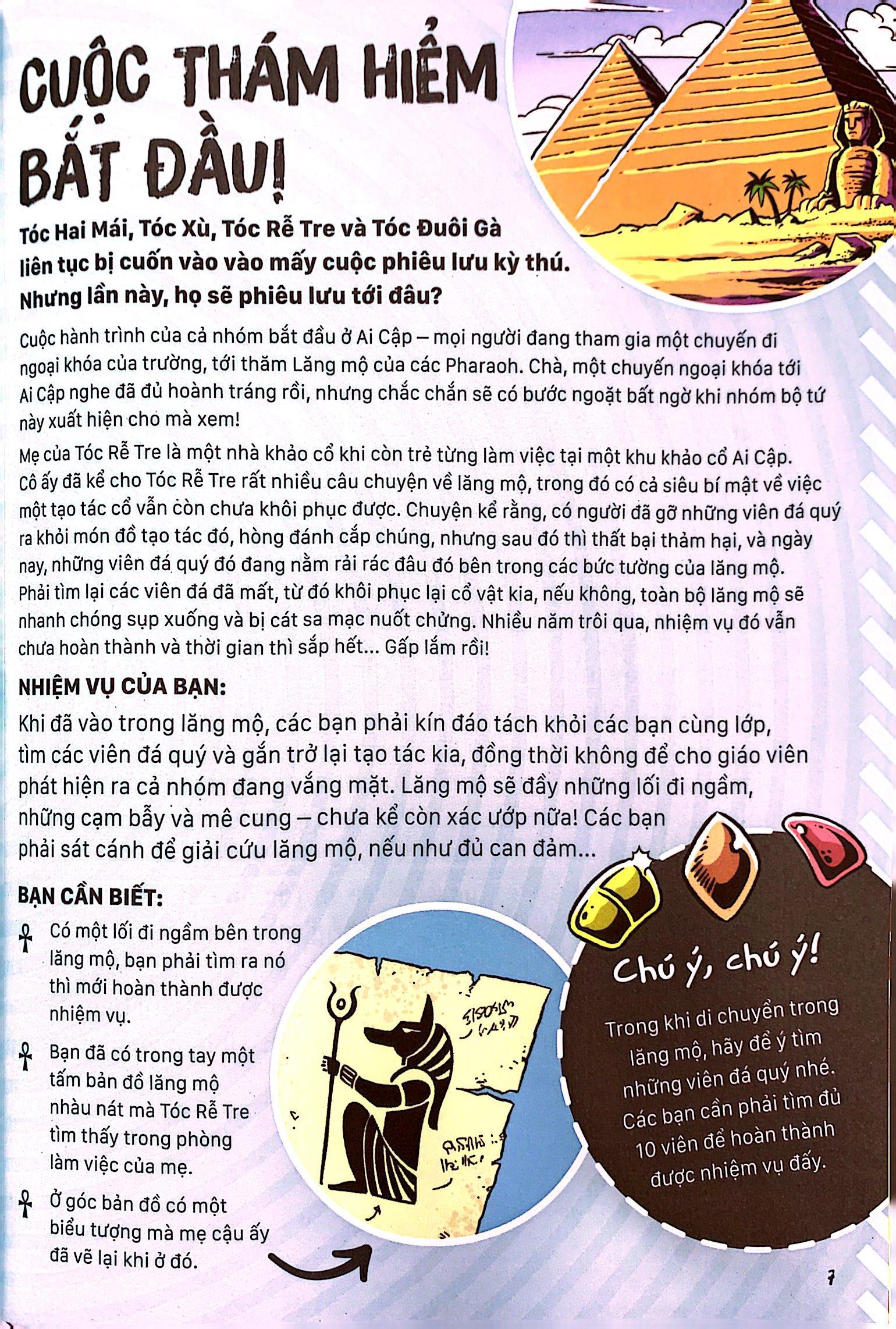 “Trò chơi thoát hiểm - Lăng mộ Ai Cập” kể về hành trình của nhóm bạn nhằm thoát khỏi lăng mộ Ai Cập của các pharaoh. Cách đây rất lâu, một tên trộm đã cố gắng lấy trộm đá quý từ một món đồ tạo tác cổ được cất giấu trong kim tự tháp, nhưng rồi lại đánh rơi chúng quanh lăng mộ. Không có bảo vật này, kim tự tháp sẽ dần chìm xuống cát. Để trả lại những viên đá quý bị đánh cắp và cứu kim tự tháp khỏi bị chìm, bạn sẽ cần phải căng óc lên để vượt qua các thử thách và thoát ra khỏi lăng mộ thành công. Đây là cuốn sách hoàn hảo giúp các độc giả từ 7 tuổi trở lên vừa rèn luyện trí não vừa có những giờ phút vui chơi đầy hào hứng.
