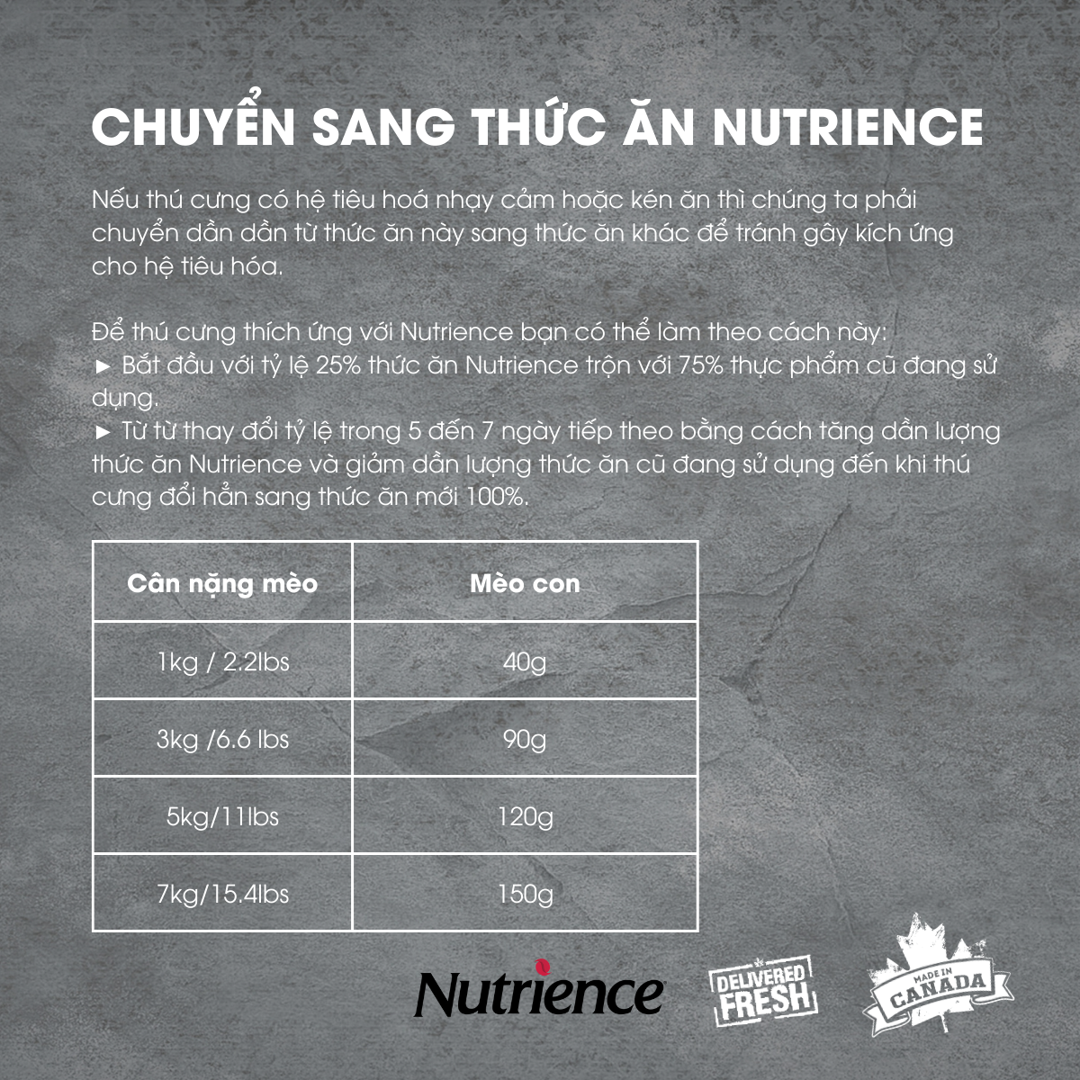 - Điều quan trọng là phải chuyển dần dần mèo con của bạn từ thức ăn này sang thức ăn khác. Bắt đầu với tỷ lệ 25% thức ăn Nutrience trộn với 75% thức ăn cũ. Từ từ thay đổi tỷ lệ trong 5 đến 7 ngày tiếp theo bằng cách tăng dần lượng thức ăn Nutrience và giảm dần lượng thức ăn cũ. Trọng lượng số lượng / ngày