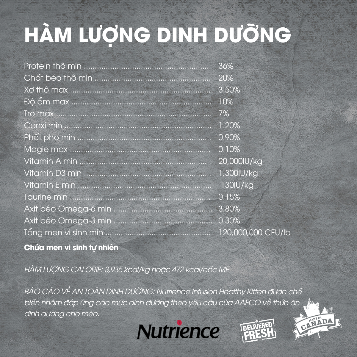 - Sản phẩm Nutrience Original Healthy Kitten được chế biến để đáp ứng các mức dinh dưỡng cho sự tăng trưởng được thiết lập trong hồ sơ dinh dưỡng thức ăn cho mèo của AAFCO. Hướng dẫn cách cho ăn