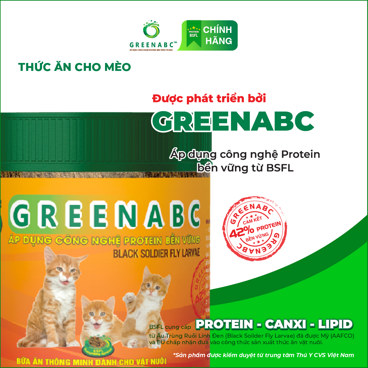 GREENABC là thức ăn cao cấp dành cho các mèo. Đặc biệt sản phẩm GREENABC được sản xuất theo phương pháp Áp dụng công nghệ PROTEIN BỀN VỮNG từ bột đạm G.Meal rất giàu PROTEIN–CANXI–LIPID có trong BSFL*, đã được Mỹ (AAFCO) và EU chấp nhận đưa vào công thức cho ngành sản xuất thức ăn dành cho thú cưng.