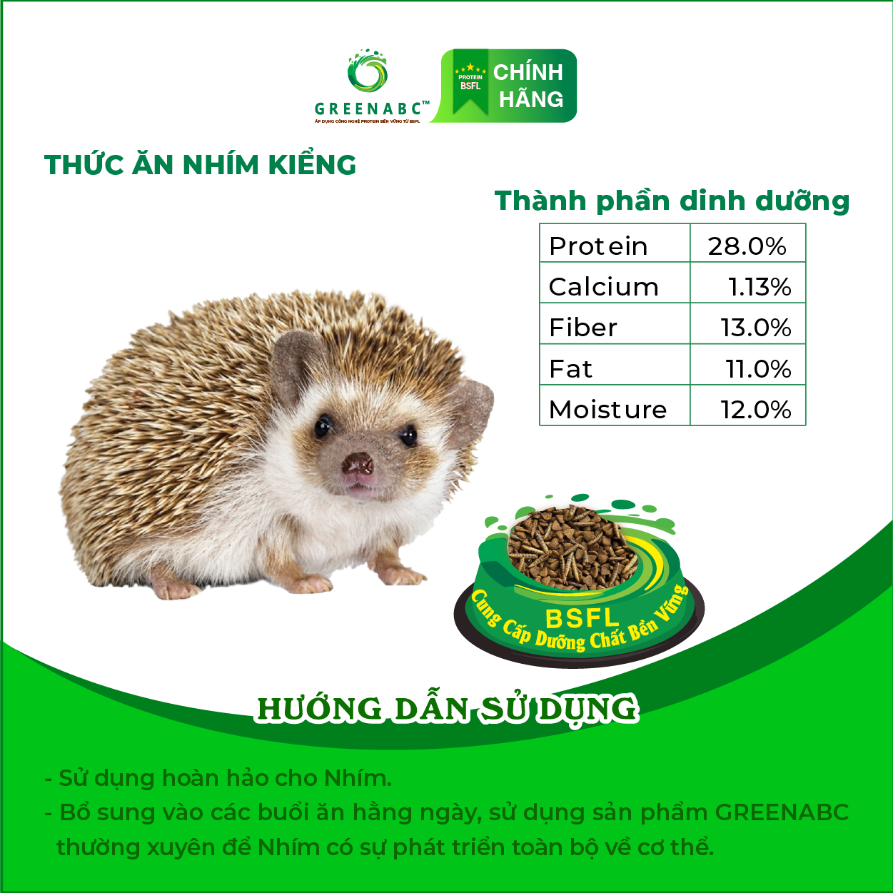 GREENABC - THỨC ĂN NHÍM KIỂNG GREENABC là thức ăn cao cấp dành cho NHÍM KIỂNG. Đặc biệt sản phẩm GREENABC được sản xuất theo phương pháp Áp dụng công nghệ PROTEIN bền vững rất giàu PROTEIN – CANXI – LIPID có trong BSFL, đã được Mỹ (AAFCO) và EU chấp nhận đưa vào công thức cho ngành sản xuất thức ăn cho vật nuôi. Sản phẩm GREENABC cung cấp các giá trị dinh dưỡng bền vững cho thú cưng, giúp cho Nhím Kiểng: