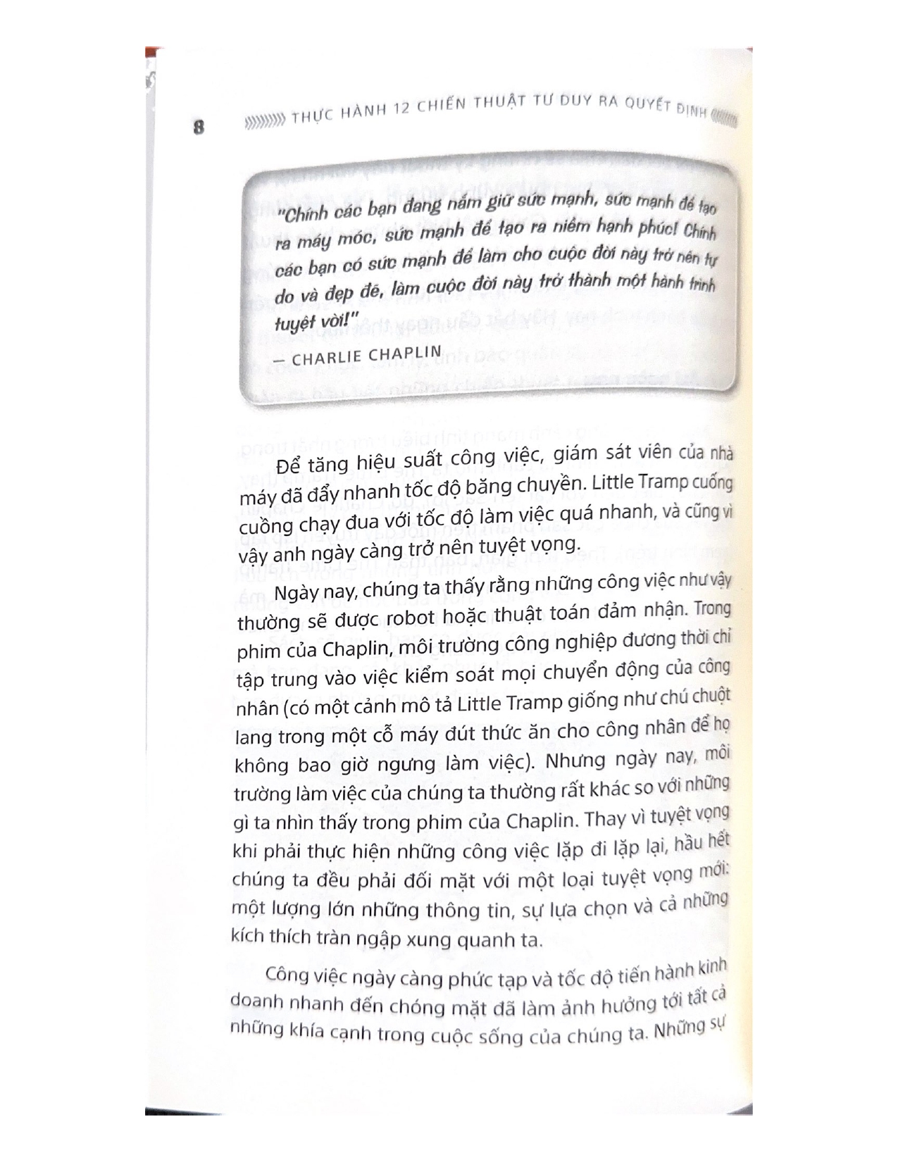 - Giới thiệu Thực Hành 12 Chiến Thuật Tư Duy Ra Quyết Định Cuộc sống chính là kết quả của những quyết định. Mỗi ngày, chúng ta đều phải đưa ra hàng trăm sự lựa chọn khác nhau: từ những lựa chọn đơn giản (như trưa nay ăn gì), cho đến những lựa chọn quan trọng (như làm công việc gì và sống ở đâu). Chúng ta đang sống trong một thế giới ngày càng phức tạp, vậy nên rất cần những mô hình tư duy giúp ta phân tích thực tế một cách hiệu quả và đưa ra những quyết định sáng suốt hơn, nhanh chóng hơn. Cuốn sách mà bạn đang cầm trên tay sẽ mang đến nhiều ví dụ, công cụ và chiến thuật hữu ích để bạn nâng cao chất lượng, tốc độ và hiệu quả đưa ra quyết định. Khi làm chủ được những chiến thuật trong sách, bạn sẽ dễ dàng vượt qua các tình huống tiến thoái lưỡng nan và những vấn đề hóc búa, từ đó thành công hơn trong cả công việc lẫn cuộc sống.