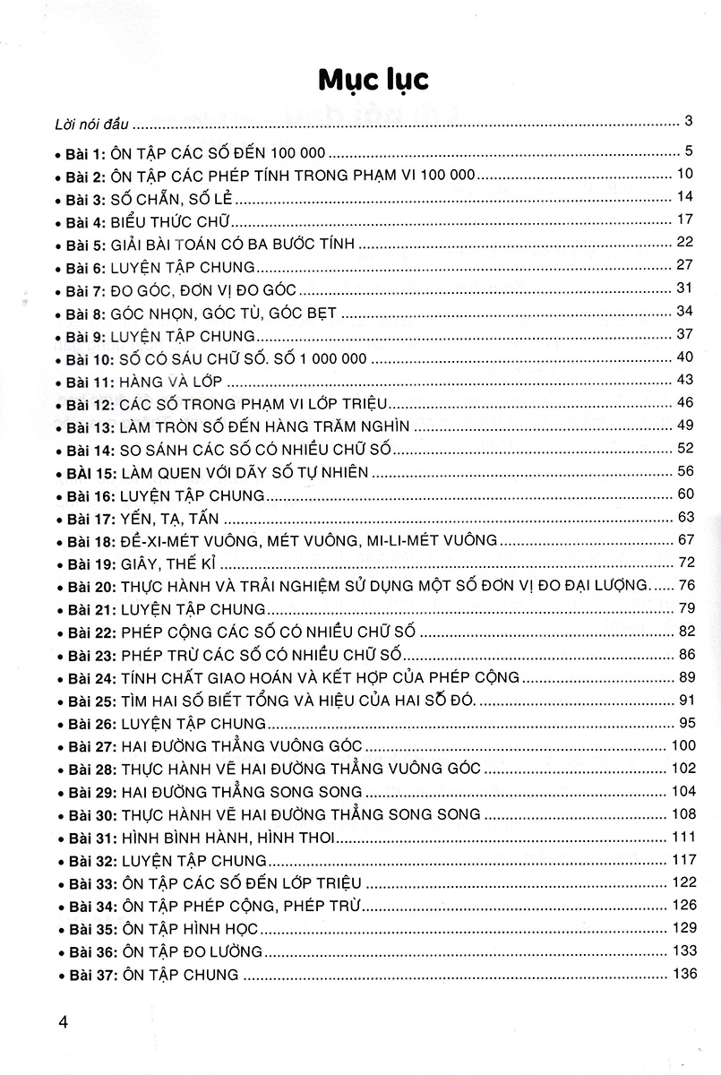 Cuốn sách được biên soạn nhằm giúp các em học sinh lớp 4 có được những kiến thức, kĩ năng toán học cơ bản và yêu thích môn Toán thông qua các hoạt động gắn liền với thực tiễn cuộc sống.
