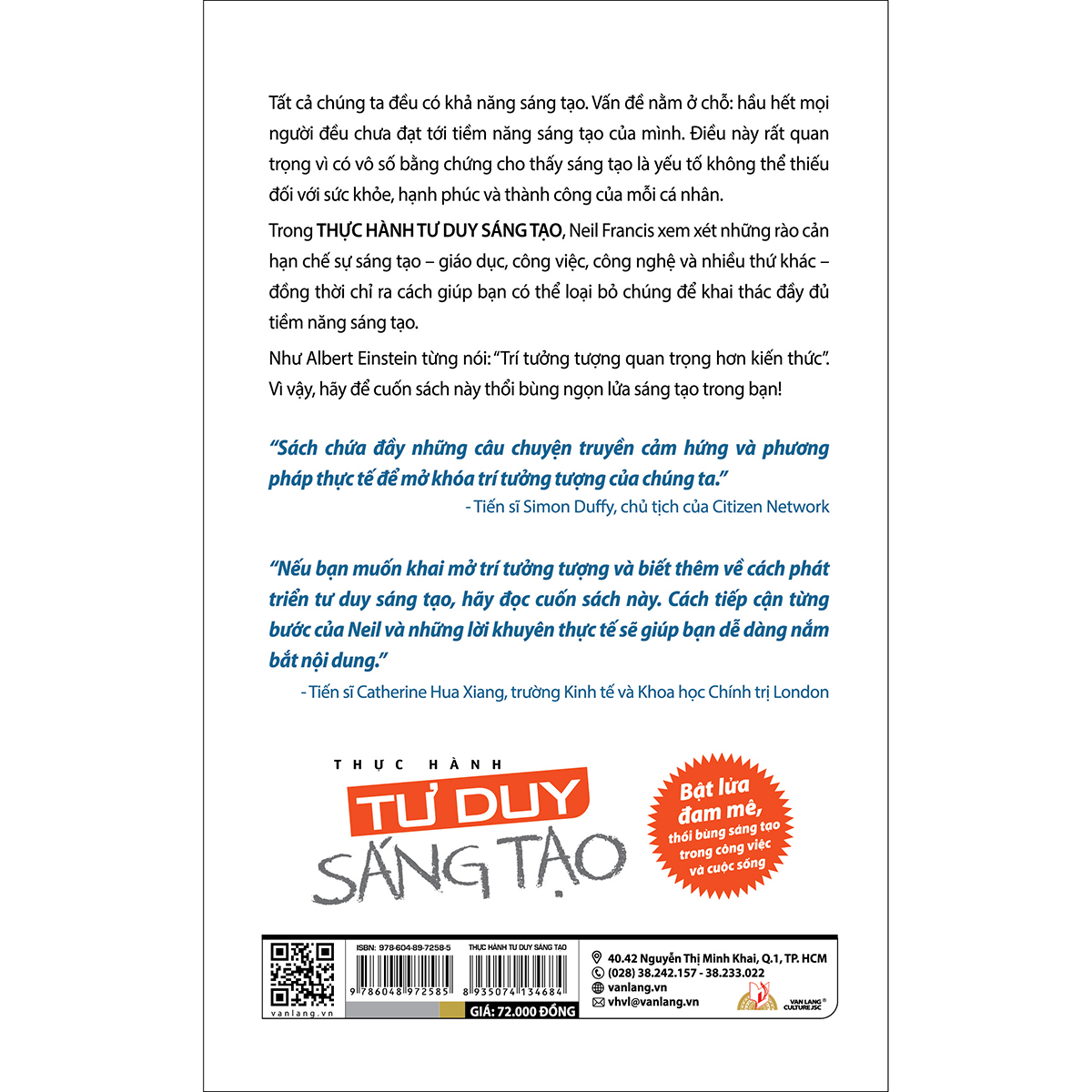 Tất cả chúng ta đều có khả năng sáng tạo. Vấn đề nằm ở chỗ: hầu hết mọi người đều chưa đạt tới tiềm năng sáng tạo của mình. Điều này rất quan trọng vì có vô số bằng chứng cho thấy sáng tạo là yếu tố không thể thiếu đối với sức khỏe, hạnh phúc và thành công của mỗi cá nhân. Trong THỰC HÀNH TƯ DUY SÁNG TẠO, Neil Francis xem xét những rào cản hạn chế sự sáng tạo – giáo dục, công việc, công nghệ và nhiều thứ khác – đồng thời chỉ ra cách giúp bạn có thể loại bỏ chúng để khai thác đầy đủ tiềm năng sáng tạo. Như Albert Einstein từng nói: “Trí tưởng tượng quan trọng hơn kiến thức”. Vì vậy, hãy để cuốn sách này thổi bùng ngọn lửa sáng tạo trong bạn! “Sách chứa đầy những câu chuyện truyền cảm hứng và phương pháp thực tế để mở khóa trí tưởng tượng của chúng ta.”