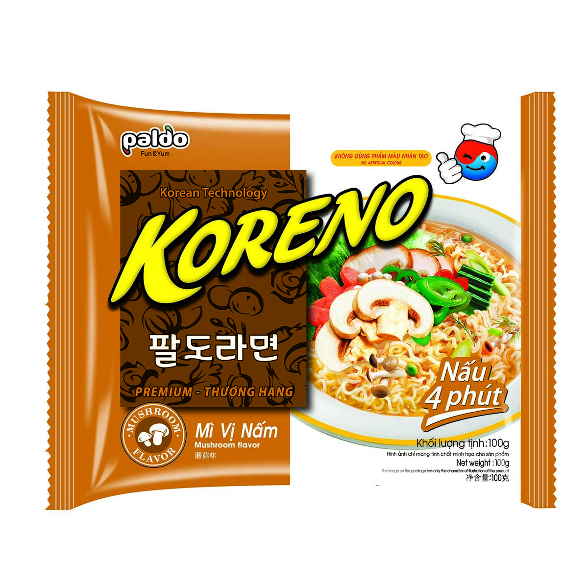 Mì Koreno vị Nấm là dòng sản phảm thế mạnh của Paldo. Sự tinh tế trong từng gói mì được cải tiến với công nghệ Hàn Quốc, đem đến độ dai giòn bóng bẩy, hòa quyện với nước dùng đặc trưng, tạo nên hương vị, mùi thơm tinh tế, quyến rũ. Gói gia vị được kết tinh từ những nguyên liệu tươi ngon nhất giúp cho hương vị hòa quyện hơn, đậm đà hơn, nước dùng chua cay, thanh ngọt phù hợp với nhiều lứa tuổi. Hướng dẫn nấu: Áp dụng cho 1 gói lẻ 100g