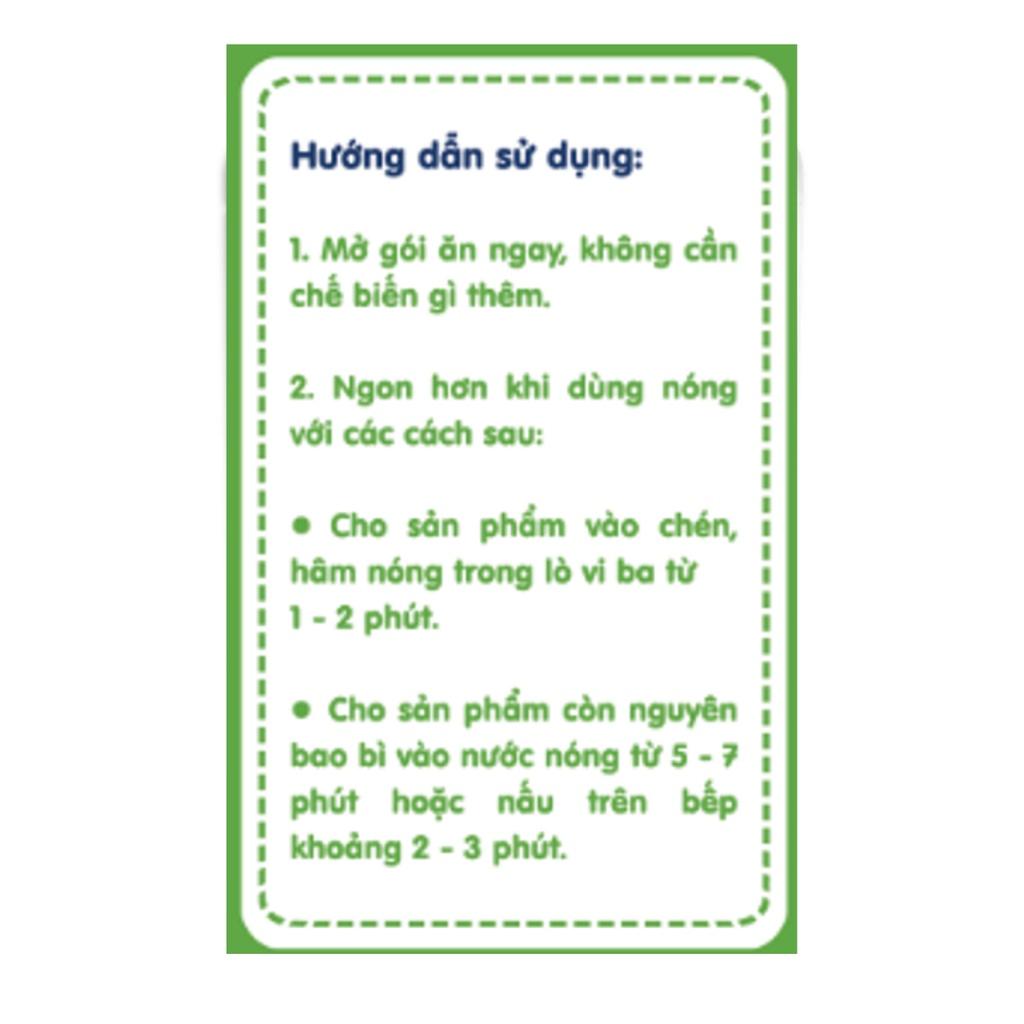 2. Ngon hơn khi dùng nóng với các cách sau: • Mở gói, cho sản phẩm vào chén, hâm nóng trong lò vi ba từ 1 – 2 phút. • Cho sản phẩm còn nguyên bao bì vào nước nóng khoảng 5 – 7 phút hoặc nấu trên bếp khoảng 2 – 3 phút. Hạn sử dụng : 12 tháng kể từ ngày sản xuất. Đối tượng sử dụng: Trẻ từ 10 tháng tuổi và người lớn. Thương hiệu : Sài Gòn Food. Xuất xứ: Việt Nam.