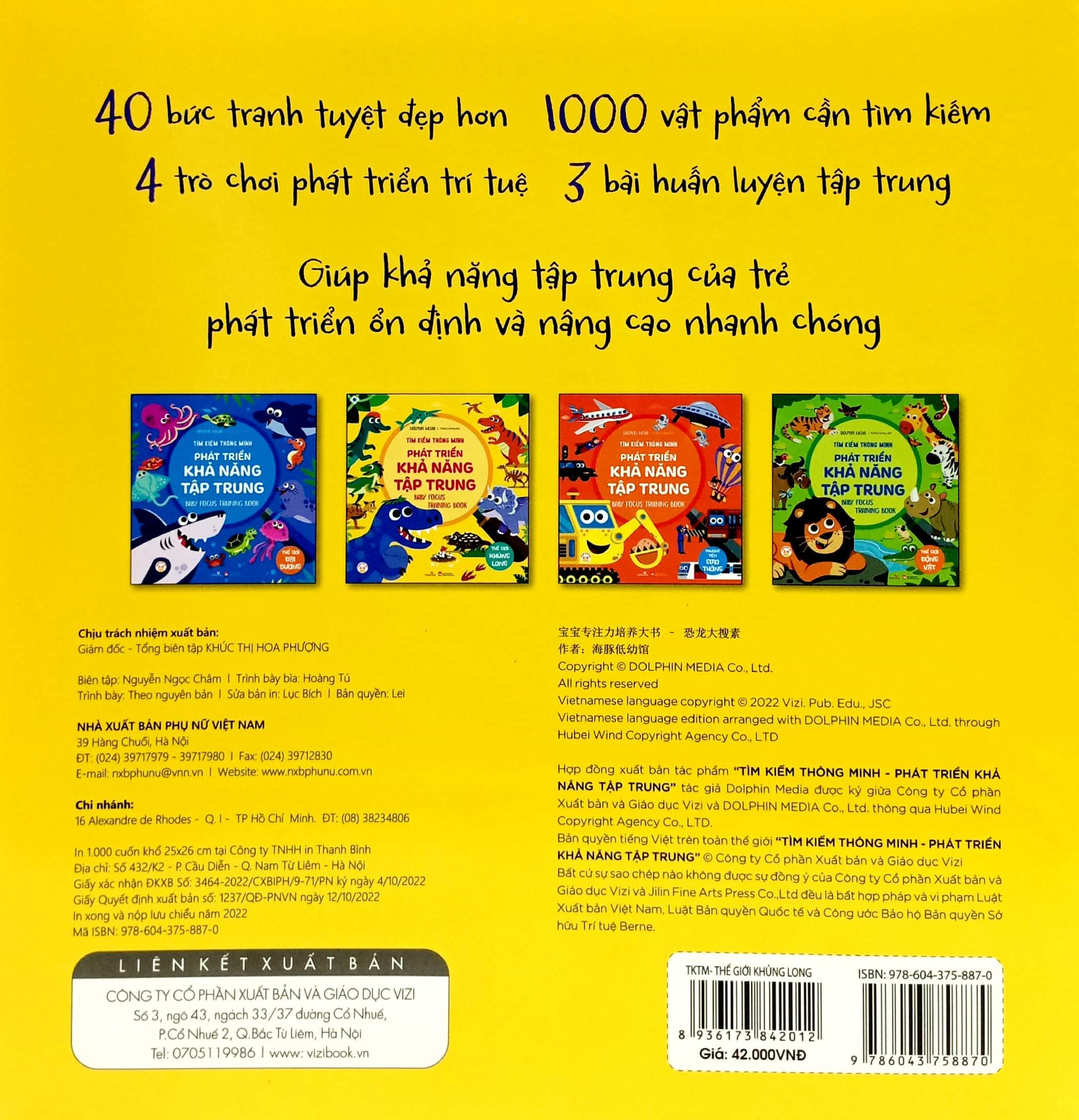 Thêm cuốn sách tranh đẹp từ ngoài vào trong, vô cùng sinh động TÌM KIẾM THÔNG MINH PHÁT TRIỂN KHẢ NĂNG TẬP TRUNG chủ đề Thế giới khủng long. Cuốn sách đưa bé đến công viên khủng long, tham gia vũ hội khủng long, xem bảo tàng tiền sử khủng long…và nhanh mắt, nhanh tay để tìm kiếm những chú khủng long đang ẩn nấp ở đâu đó theo gợi ý nhé!