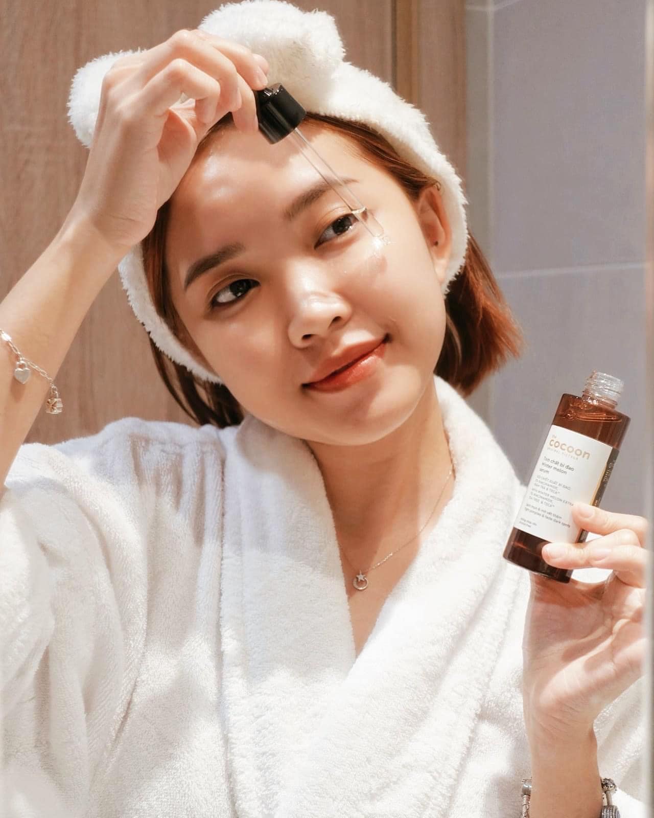 - Vitamin B3 (Niacinamide): Giúp hỗ trợ sạch mụn hiệu quả, kiểm soát lượng dầu thừa và làm giảm sự xuất hiện của lỗ chân lông to. Thành phần đầy đủ tinh chất bí đao cocoon Aqua/Water, Niacinamide, Salicylic Acid, Cocamidopropyl Dimethylamine, Benincasa Cerifera Fruit Extract, Centella Asiatica Extract, Butylene Glycol, Pentylene Glycol, Bisabolol, Zinc PCA, Phellodendron Amurense Bark Extract, Glycereth-26, Bis-PEG-18 Methyl Ether Dimethyl Silane, Melaleuca Alternifolia Leaf Oil, Lavandula Angustifolia Flower Oil, Rosmarinus Officinalis Leaf Oil, Phenoxyethanol, Trisodium Ethylenediamine Disuccinate, Ethylhexylglycerin, Farnesol. Hướng dẫn sử dụng tinh chất bí đao cocoon Lấy vài giọt tinh chất vào lòng bàn tay, xoa đều và mát-xa lên da mặt sạch, tránh vùng mắt. Sử dụng sáng và tối. Cam kết tinh chất bí đao cocoon