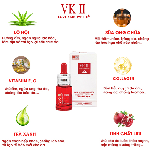 Tinh chất dưỡng phục hồi da mỏng đỏ, dị ứng VK-II Love Skin White Face Serum Collagen 15ml THÔNG TIN CHI TIẾT VỀ SERUM DƯỠNG PHỤC HỒI DA MỎNG ĐỎ, DỊ ỨNG VK-II - Thương
