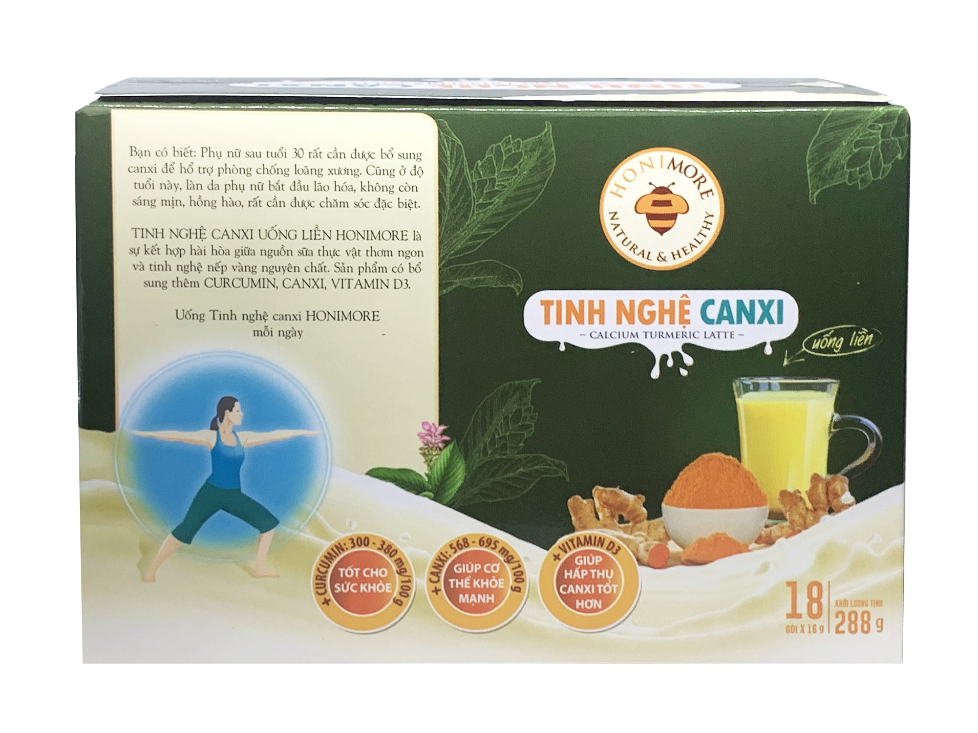 - Tinh bột nghệ canxi của Honimore được làm từ bột nghệ đỏ, có hàm lượng curcumin cao gấp 4 lần nghệ vàng thông thường.