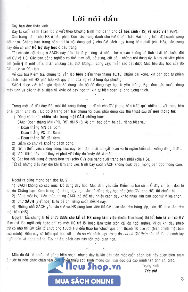 Đây là cuốn sách Toán lớp 2 viết theo chương trình mới dành cho cả học sinh và giáo viên. Các trang dành cho HS luôn ở bên phải, còn trang dành cho GV luôn ở bên trái tương ứng. Hai trang luôn đặt cạnh nhau, sóng đôi nhau. Chẳng hạn trang bên này đều có chữ hỗ trợ dạy học ở đầu trang.