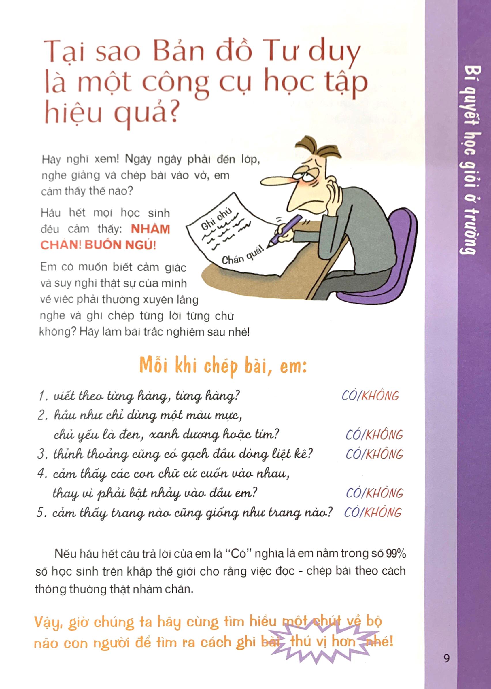 Trong cuốn sách Bí quyết học giỏi ở trường, Tony Buzan đã chỉ ra rằng, bộ não người chia thành bán cầu não phải và bán cầu não trái, với mỗi bán cầu não đảm nhiệm những chức năng khác nhau. Khi ghi bài ở trường và làm bài tập về nhà, các em thường hay dùng phần bán cầu não trái. Như vậy, với cách chép bài và học tập theo kiểu truyền thống, các em mới chỉ sử dụng ½ tiềm năng tuyệt vời của não bộ. Với Bản đồ Tư duy, Tony Buzan hướng các em tập trung vào phần trọng tâm, cũng như tất cả các chi tiết khác có liên quan. Công cụ này có thể giúp các em sử dụng được cả hai bán cầu não, và theo đó giúp các em cảm thấy say mê học tập hơn. Bí quyết học giỏi ở trường không chỉ giúp các em học tốt các môn học như Ngữ văn, Toán, Lịch sử, Khoa học, Địa lý, tiếng Anh… mà đó còn là phương pháp giúp các em hệ thống lại những gì đã học, nhờ vậy sẽ nắm bắt và vận dụng kiến thức dễ dàng hơn.