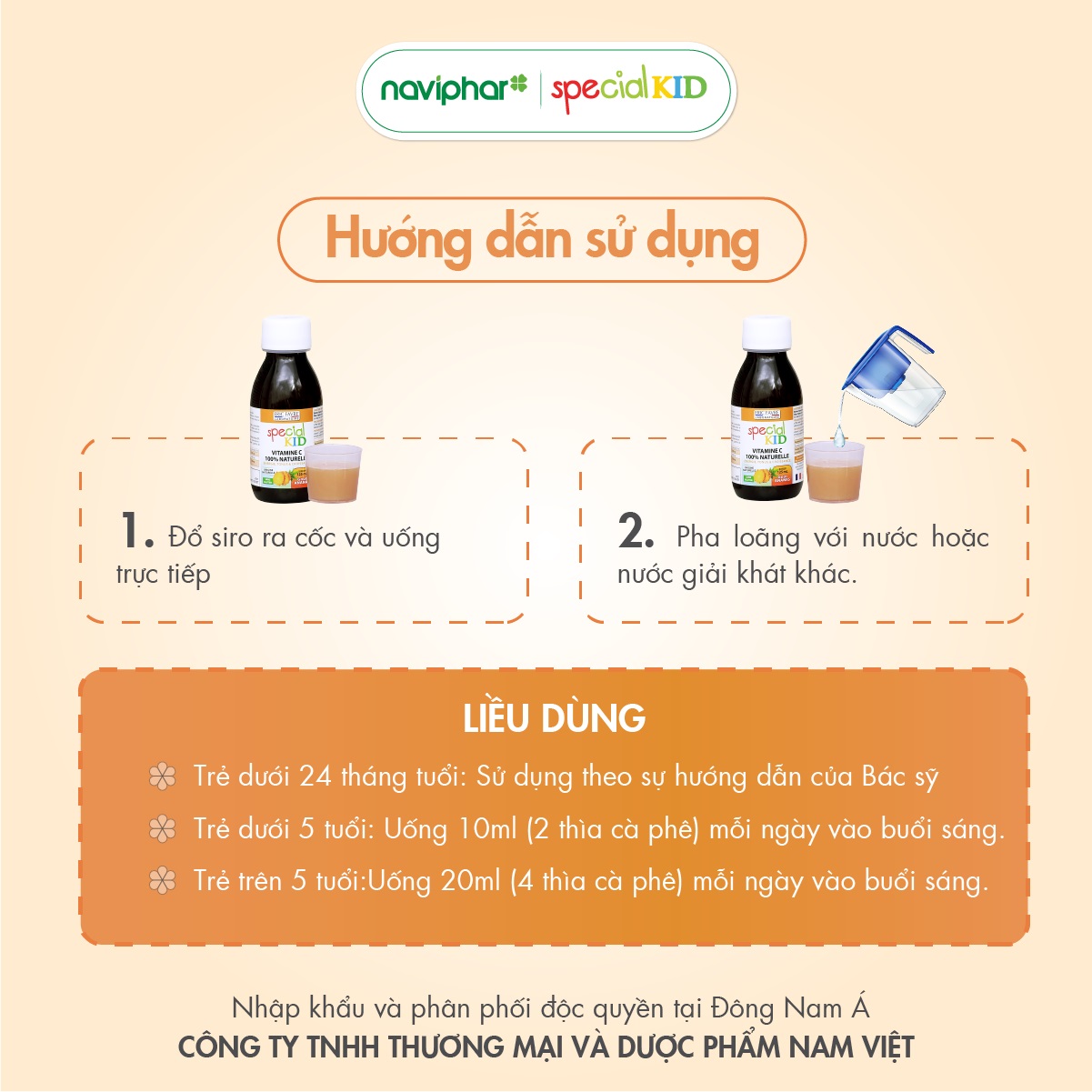 Siro bổ sung Vitamin C tự nhiên TPBVSK Special Kid Vitamine C 100% Naturelle / Special Kid 100% Natural Vitamin C 125ml Tăng cường hấp thụ sắt, tăng sức đề kháng, chống nhiễm trùng, bảo vệ thành mạch máu [Nhập khẩu - Pháp] Special Kid là thương hiệu nhập khẩu nguyên hộp từ Pháp, đáp ứng hầu hết nhu cầu phòng và hỗ trợ điều trị các bệnh thường gặp của trẻ trong những năm tháng đầu đời. Special Kid Vitamine C 100% Naturelle được bào chế chuyên biệt dành cho trẻ em, mùi vị dễ chịu, chỉ cần sử dụng 1 lần/ngày. Tiết kiệm. Dễ nhớ Công dụng : Bổ sung Vitamin C cho cơ thể. Hỗ trợ bảo vệ thành mạch máu. Hỗ trợ tăng cường sức đề kháng. Đối tượng sử dụng : Trẻ có chế độ ăn thiếu Vitamin C Trẻ hay bị chảy máu chân răng Trẻ chảy máu cam do thiếu vitamin C. Trẻ có sức đề kháng kém Hướng dẫn sử dụng : Trẻ em dưới 24 tháng tuổi : Sử dụng theo hướng dẫn của Bác sỹ. Trẻ dưới 5 tuổi : Uống 10ml (1 thìa cà phê) mỗi ngày vào buổi sáng. Trẻ trên 5 tuổi : Uống 20ml (2 thìa cà phê) mỗi ngày vào buổi sáng. Lắc kỹ trước khi dùng. Có thể uống trực tiếp hoặc pha loãng với nước hay nước giải khát khác. Giá trên đã bao gồm thuế giá trị gia tăng theo luật định. Sản phẩm không phải là thuốc, không có tác dụng thay thế thuốc chữa bệnh. Thông tin sản phẩm : Đóng gói : Chai / Hộp Mùi hương : Vị ngọt Hương vị dứa Dung tích : Chai 125ml Xuất xứ : Pháp Thành phần : Thành phần chính trong 1 liều 20ml: Dịch chiết quả Rosa canina/ Tầm xuân ………… 7.000 mg Dịch chiết quả Ribes nigrum/ Lý chua ………… 7.000 mg Bột quả Malpighia punicifolia/ Sơ ri ………… 320 mg (Vitamin C ………… 80 mg) Nhập khẩu & phân phối : Công ty TNHH TM và DP Nam Việt
