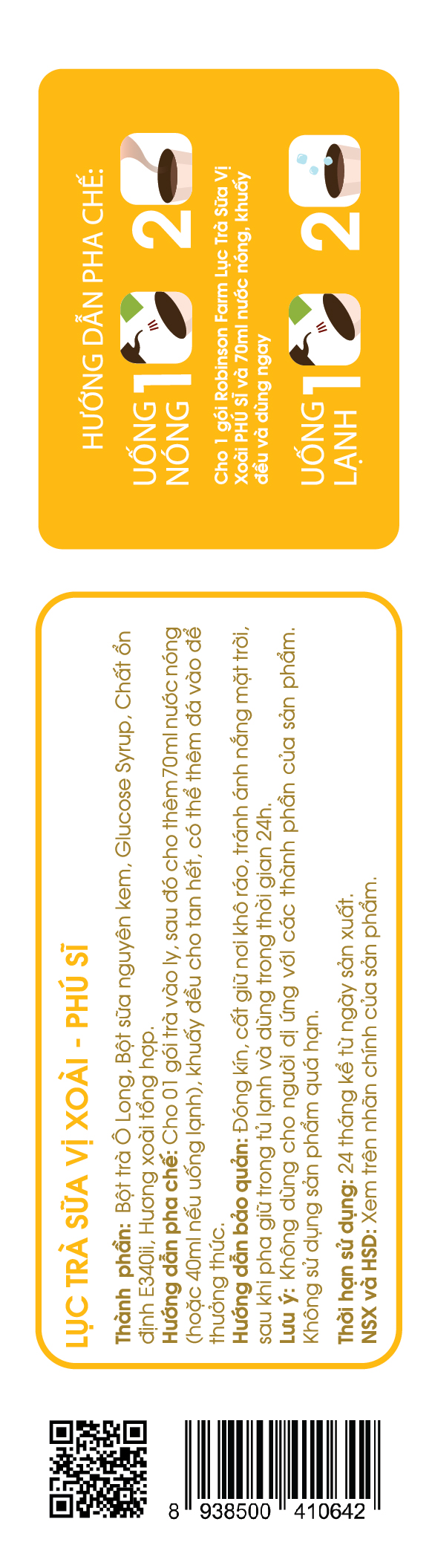 THÔNG TIN SẢN PHẨM Định lượng : 90g ( 5 gói * 18g ) Thương hiệu: ROBINSON FARM Xuất xứ: Việt Nam Nơi sản xuất: Công ty TNHH Rainbow Việt Nam Trà sữa Phú Sỹ - Lục Trà Sữa Vị Xoài mang đến trải nghiệm tuyệt vời với sự kết hợp hoàn hảo giữa ba hương vị đặc trưng: Béo vị sữa, thơm vị xoài và đậm vị trà. Sản phẩm được chế biến từ nguồn nguyên liệu tươi ngon, với những trái xoài chín mọng và trà xanh Nhật Bản thượng hạng, cùng công nghệ sản xuất hiện đại giúp giữ trọn hương vị tự nhiên. Mỗi ngụm trà sữa Phú Sỹ là sự hòa quyện hoàn hảo giữa độ béo ngậy của sữa, hương xoài tươi mát và trà đậm đà, tạo nên một thức uống vừa ngon miệng vừa dễ chịu.