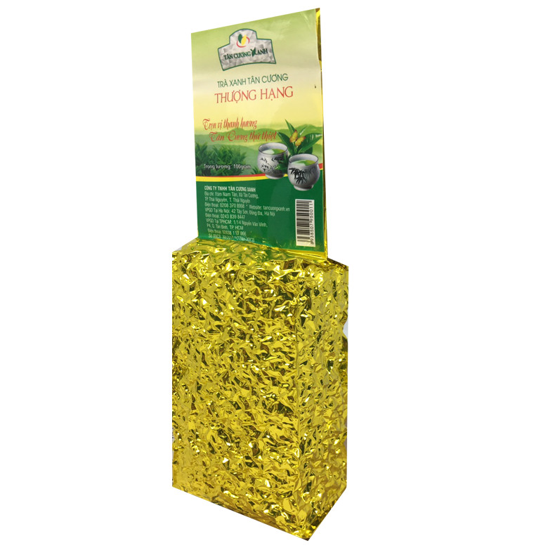 - Quy cách sản phẩm: túi nhôm hút chân không 100 gram màu vàng. Trà một tôm hai lá được hái từ đầu búp gồm 1 búp và 2 lá non. Trà được tuyển lựa từ những đồi trà ngon nhất từ vùng Tân Cương Thái Nguyên với thổ nhưỡng đặc biệt không nơi nào có. Trà chỉ được thu hái vào những ngày râm mát hoặc buổi sáng sớm trước lúc mặt trời lên. Trà được hái bằng việc lấy hai kẽ tay bẻ lấy hai lá non và 1 búp ở trên chứ không bấm ngắt trà. Từ công đoạn thu hái – chế biến – đóng gói đều được thực hiện bằng quy trình khép kín là sự kết hợp giữa kinh nghiệm của nghệ nhân truyền thống và máy móc nhập khẩu từ Đài Loan. Bởi thế nên trà này được coi là thứ trà Thượng Hạng bởi chất lượng tuyệt hảo của nó. Hướng dẫn sử dụng: - Cho 10 gram trà vào ấm (chừng 1 xúc trà)