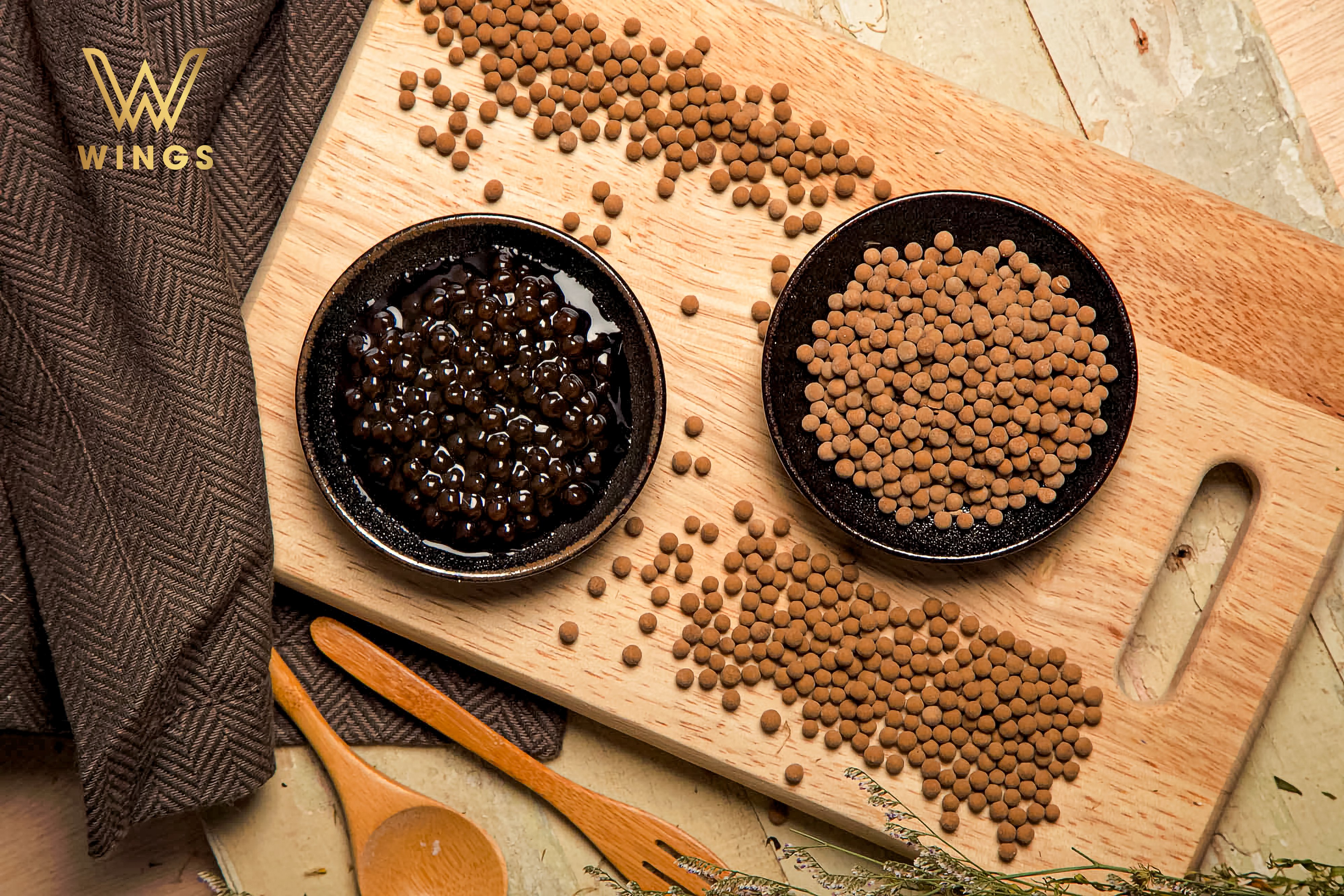 Trân châu đen Wings có ưu điểm: mềm, dẻo trong 10 – 12 tiếng, rất thích hợp làm sữa tươi đường đen, trà sữa. Thử để cảm nhận vị thơm của đường đen, bí đao và thảo mộc.