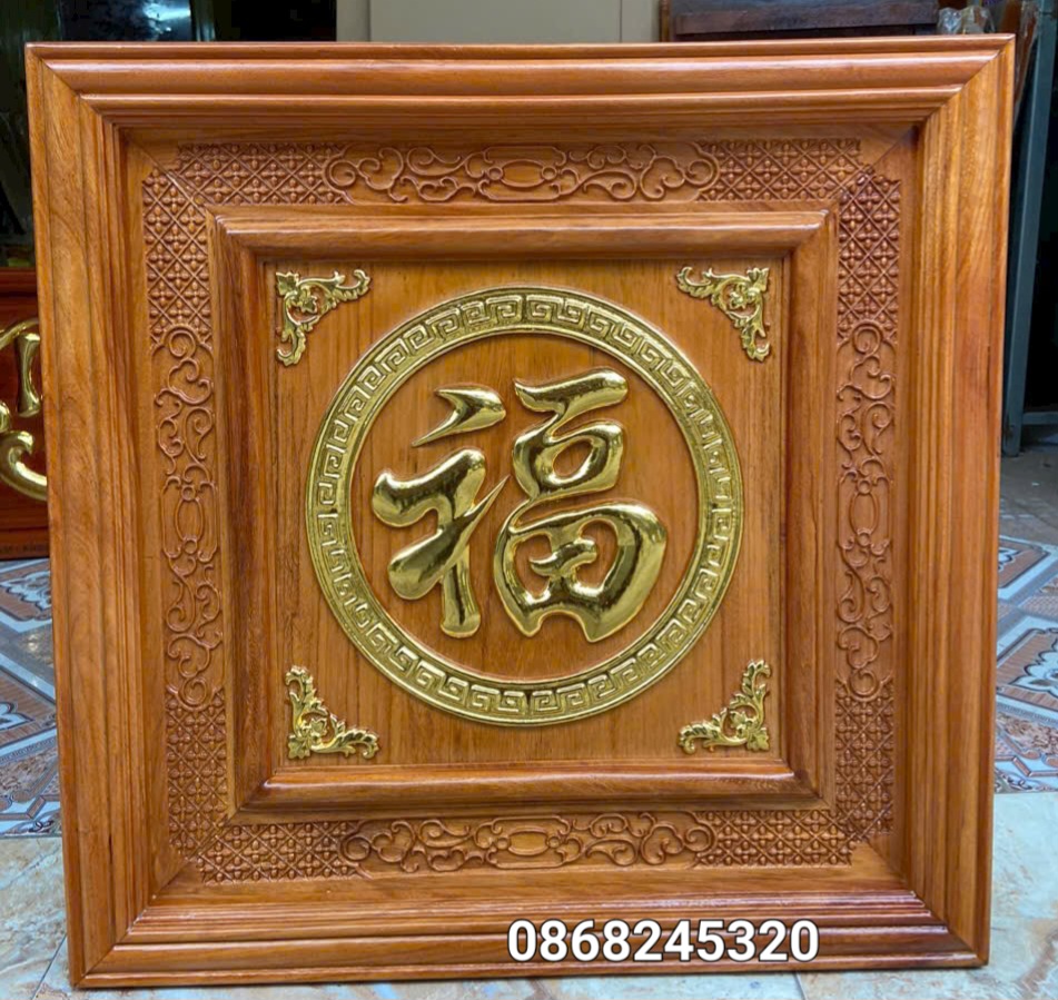 _ Tranh chữ phúc được làm bằng chất liệu gỗ gõ tự nhiên 100% _ Kt mặt vuông 61×61×4cm _ Tranh được khắc nổi tỉ mỉ ,tinh xảo kỳ công .Từ những người thợ giàu