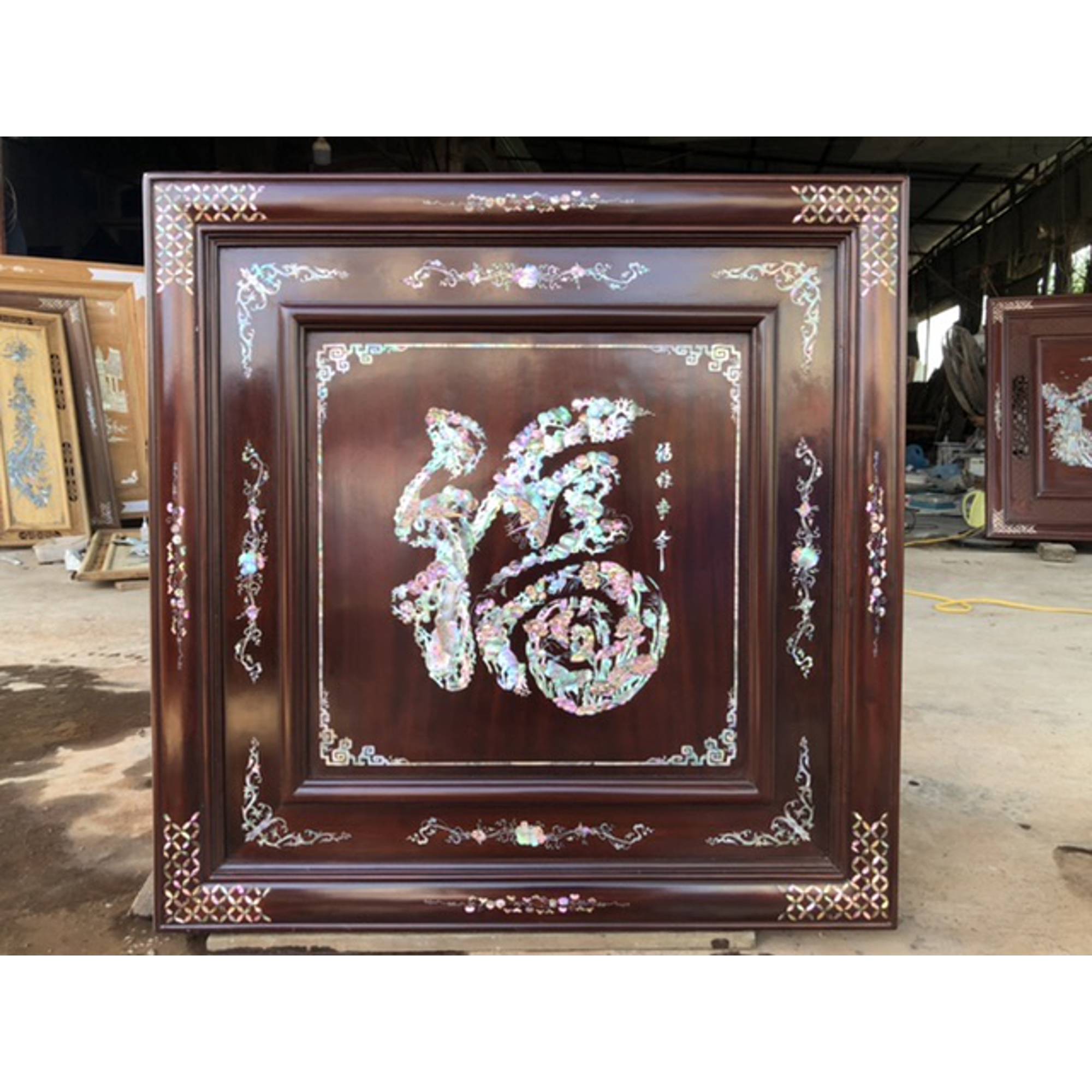 Tranh treo tường gỗ gụ chữ phúc được làm bằng chất liệu ốc biển tự nhiên 100% Kích thước mặt vuông 81×81×4cm _ Tranh treo tường chữ phúc được trạm khắc cắt xà cừ ốc biển tỉa tỉ mỉ tinh sảo kỳ công .Đi hầu hết tất cả các mọi chi tiết góc ngách đều được ngọt tỉa chỉnh sửa hoàn toàn bằng tay thủ công .Từ những người thợ dầy rặn kinh nghiệm .Cũng như tay nghề cao trong làng nghề truyền thống .Chính vì thế tranh chữ phúc đã đáp ứng đầy đủ những tiêu trí ( Đẹp bền rẻ ) Thẩm mỹ nghệ thuật với chất lượng tuyệt vờ