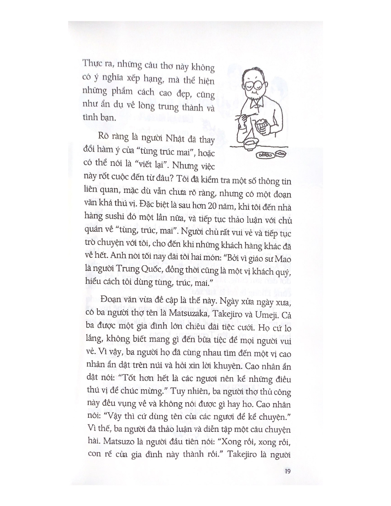 - Giới thiệu Nhật Bản Không Như Bạn Nghĩ Theo phong tục của người Nhật, kể chuyện ma vào mùa hè là một thói quen, nhất là khi người lớn kể cho trẻ con nghe. Người ta cho rằng đó là để tận hưởng sự mát mẻ, vì những câu chuyện ma có thể khiến con người dịu lại sau khi nghe xong. Tuy nhiên, ngay cả với phong tục như vậy, không ai nghĩ rằng xã hội hiện thực ở Nhật Bản có thể biến giả thành thật, và không có sự phân biệt giữa người và ma. Tôi may mắn được một lần tham gia “tang lễ sống” của một người bạn. Kích thước quan tài to hơn bình thường, trên nắp quan tài cũng mở một “giếng trời” như thường lệ, sao cho vừa mặt “người chết”. Ngoài ra ở hai bên còn có lỗ hở, để “người chết” nằm trong đó có thể nghe thấy những lời mà mọi người nói bên ngoài. Sau đó, người bạn đó nói với tôi: “Điều tuyệt vời nhất của cả buổi lễ là mình nằm trong quan tài nghe giọng nói của mỗi người, vì âm vọng rất to, ván gỗ lại chắc chắn, cứ như bản thân biến thành một khúc gỗ thẳng tắp đặt trong đó vậy, trường sinh bất tử”. Tác giả nhìn Nhật Bản bằng chính những trải nghiệm sinh sống và giảng dạy ở đất nước này. Qua góc nhìn và cảm nhận tinh tế của tác giả về văn hóa, ẩm thực, con người, văn học nghệ thuật và giáo dục ở Nhật Bản, độc giả sẽ nhìn thấy một Nhật Bản hoàn toàn khác với sách vở thông thường.
