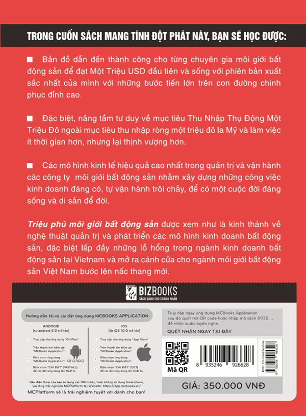 Nghề bất động sản – lựa chọn hoàn hảo cho bất kỳ người nào có máu kinh doanh và nhiều tham vọng Với chi phí khởi nghiệp tương đối thấp và không có mức trần cứng nhắc giới hạn thu nhập, nghề bất động sản dường như là lựa chọn hoàn hảo cho bất kỳ người nào có máu kinh doanh và nhiều tham vọng. Trong ngành này, bạn tự định ra hạn mức cho mình. Cách tiếp cận, khả năng và niềm đam mê môi giới bất động sản sẽ là những nhân tố quyết định lớn nhất cho thành công của bạn. Với “Triệu phú môi giới bất động sản”, bạn sẽ được trả lời câu hỏi quan trọng nhất mà bất kỳ ai làm môi giới bất động sản cũng có thể đã từng tự hỏi mình: “Làm thế nào tôi, với tư cách là người môi giới bất động sản, có thể tăng thu nhập của mình lên đến mức cao nhất có thể?” Trong cuốn sách này, tác giả sẽ trình bày với bạn cách suy nghĩ giống như một Triệu phú môi giới bất động sản. Sau đó, chúng tôi sẽ chỉ cho bạn biết, từng bước một, cách kiếm được một triệu đô la thu nhập ròng mỗi năm. Cuối cùng, chúng tôi sẽ chỉ ra con đường phải đi để nhận được một triệu đô la thu nhập thụ động(1) Triệu phú môi giới bất động sản được xem như là kinh thánh về nghệ thuật quản trị và phát triển các mô hình kinh doanh bất động sản, đặc biệt lấp đầy những lỗ hổng trong ngành kinh doanh bất động sản tại Việt Nam. Trên thế giới cũng như tại Việt Nam, chưa có chuyên gia nào như Gary Keller nói rõ và chi tiết về từng bước xây dựng và tăng trưởng đạt đến những thành công vang dội như vậy trong Triệu phú môi giới bất động sản. Triệu phú môi giới bất động sản được viết riêng cho những người có tinh thần làm việc tận tụy và dám mạo hiểm để trở thành những người tiên phong trong lĩnh vực kinh doanh của mình – sách này dành tặng riêng cho các chuyên gia môi giới bất động sản ở khắp mọi nơi trên thế giới. “Sách Đỏ: của chuyên gia bất động sản khắp nơi trên thế giới Trong cuốn sách mang tính đột phá này, bạn sẽ học được: