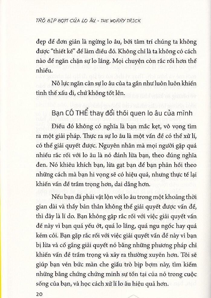 Trò Bịp Bợm Của Lo Âu - The Worry Trick Những ai nên đọc cuốn sách này? Đó là những người lo lắng quá nhiều, lo lắng về những nỗi lo lắng của họ, yêu thương những người hay lo lắng, hoặc đang đều trị cho những những hay lo lắng. Cuốn sách này dành cho những người chưa từng cân nhắc sẽ đọc một cuốn sách self-help và những người đã đọc cả chồng sách thuộc thể loại này. Nó dành cho những người chưa từng một lần tham gia trị liệu, người đang được trị liệu, và cả những người từng được đều trị nhưng kết quả thu được chỉ là nỗi thất vọng. Ngay cả những người từng thử liệu pháp nhận thức - hành vi và sử dụng thuốc mà chỉ thấy chúng phần nào có hiệu quả cũng sẽ tìm thấy trong cuốn sách này một thứ gì đó mới mẻ và đem lại sự tự do.