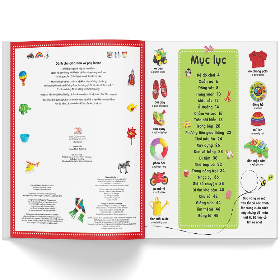 Trốn tìm – Những từ đầu tiên là cuốn sách tranh màu tuyệt vời dành cho các bậc phụ huynh cùng chia sẻ với con. Với những hình ảnh dễ thương về đồ vật giúp bé khám phá và học hỏi, cuốn sách này sẽ giúp bé xây dựng vốn từ vựng, học phân biệt màu sắc, luyện đếm số và phát triển kỹ năng quan sát. Các bé sẽ hào hứng làm quen với thế giới xung quanh qua việc tìm các đồ vật đã trốn kĩ trong tranh, từ đó dần nhận biết các đồ vật quen thuộc trong cuộc sống hàng ngày. Phương pháp giáo dục trực quan mới mẻ sẽ giúp trẻ ngày càng hào hứng, say mê tìm hiểu thế giới .