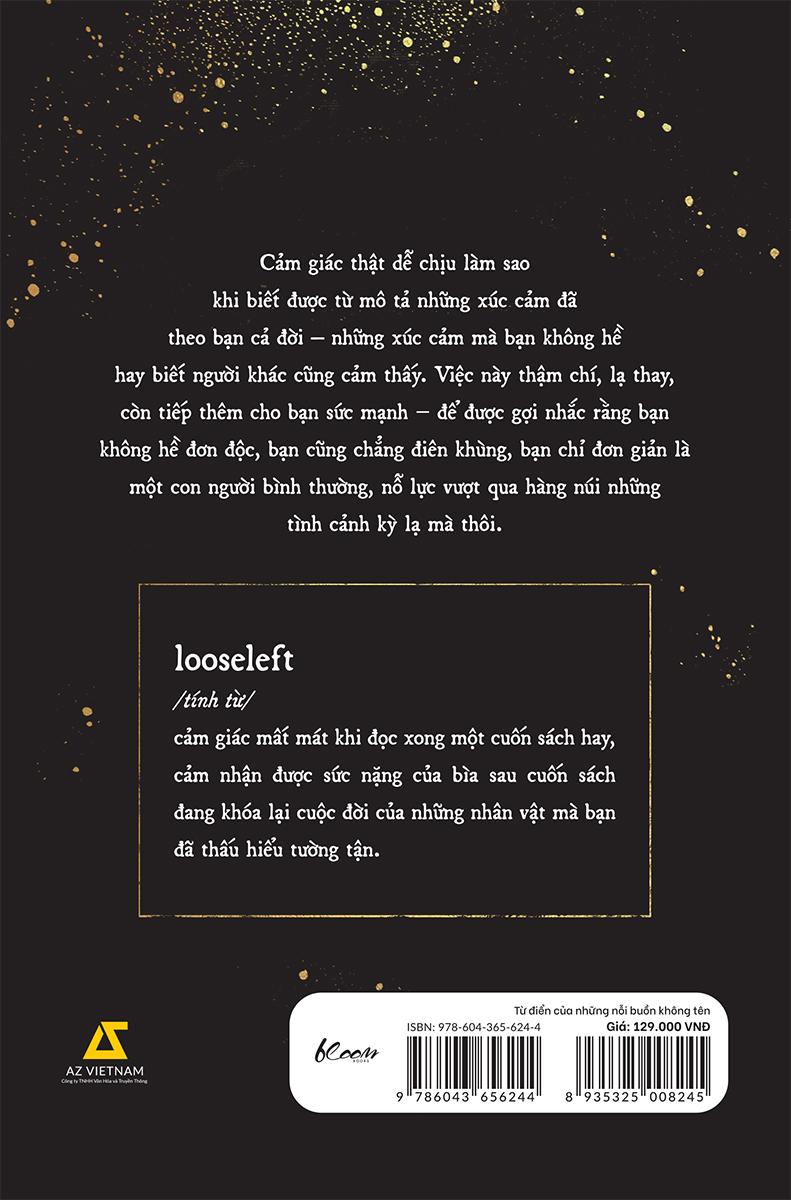 - John Koenig - Cảm giác thật dễ chịu làm sao khi biết được từ mô tả những xúc cảm đã theo bạn cả đời – những xúc cảm mà bạn không hề hay biết người khác cũng cảm thấy. Việc này thậm chí, lạ thay, còn tiếp thêm cho bạn sức mạnh − để được gợi nhắc rằng bạn không hề đơn độc, bạn cũng chẳng điên khùng, bạn chỉ đơn giản là một con người bình thường, nỗ lực vượt qua hàng núi những tình cảnh kỳ lạ mà thôi. looseleft /tính từ / cảm giác mất mát khi đọc xong một cuốn sách hay, cảm nhận được sức nặng của bìa sau cuốn sách đang khóa lại cuộc đời của những nhân vật mà bạn đã thấu hiểu tường tận. Thông tin tác giả: JOHN KOENIG sống tại Minnesota với vợ và con gái. Năm 2009, ông cho ra đời The Dictionary of Obscure Sorrows, khởi đầu là một trang blog tại địa chỉ , sau đó mở rộng thành loạt video trên YouTube. Cuốn sách của ông đã được John Green, từ tạp chí New York, và những người làm chương trình Radiolab dành lời khen ngợi. Bạn có thể liên lạc với ông qua địa chỉ obscuresorrows@.