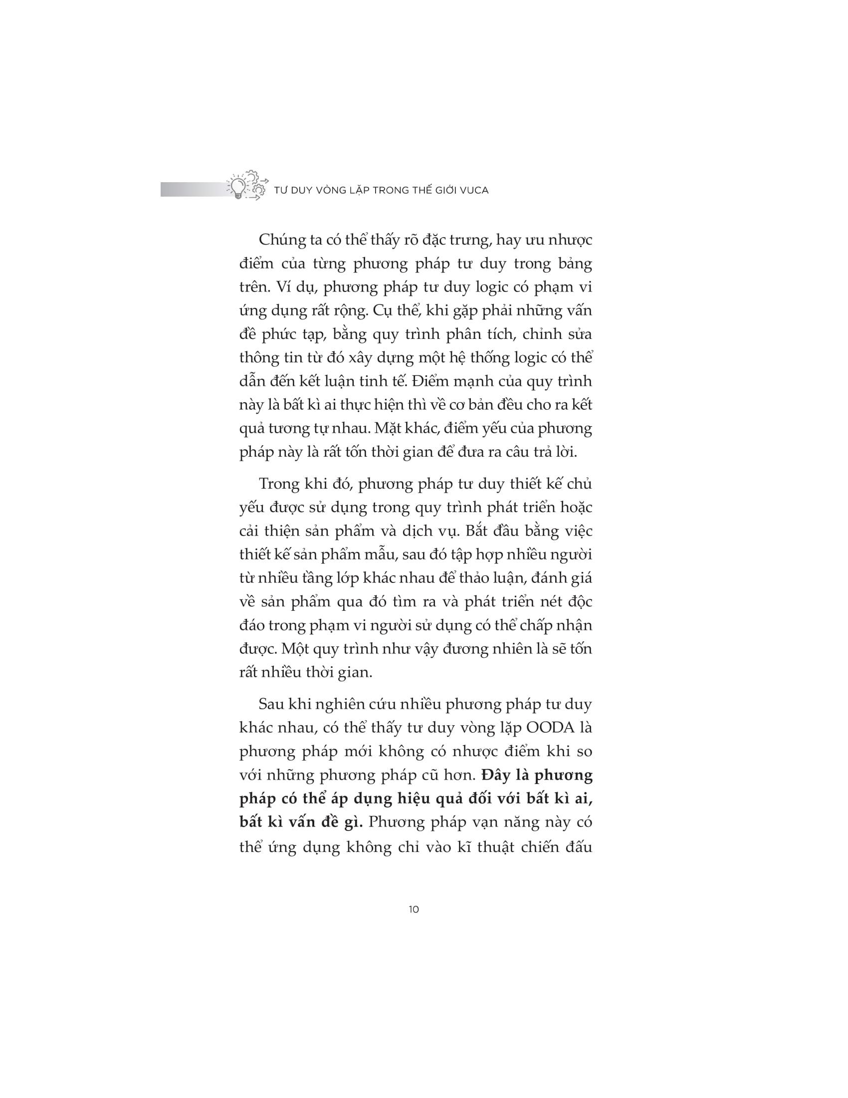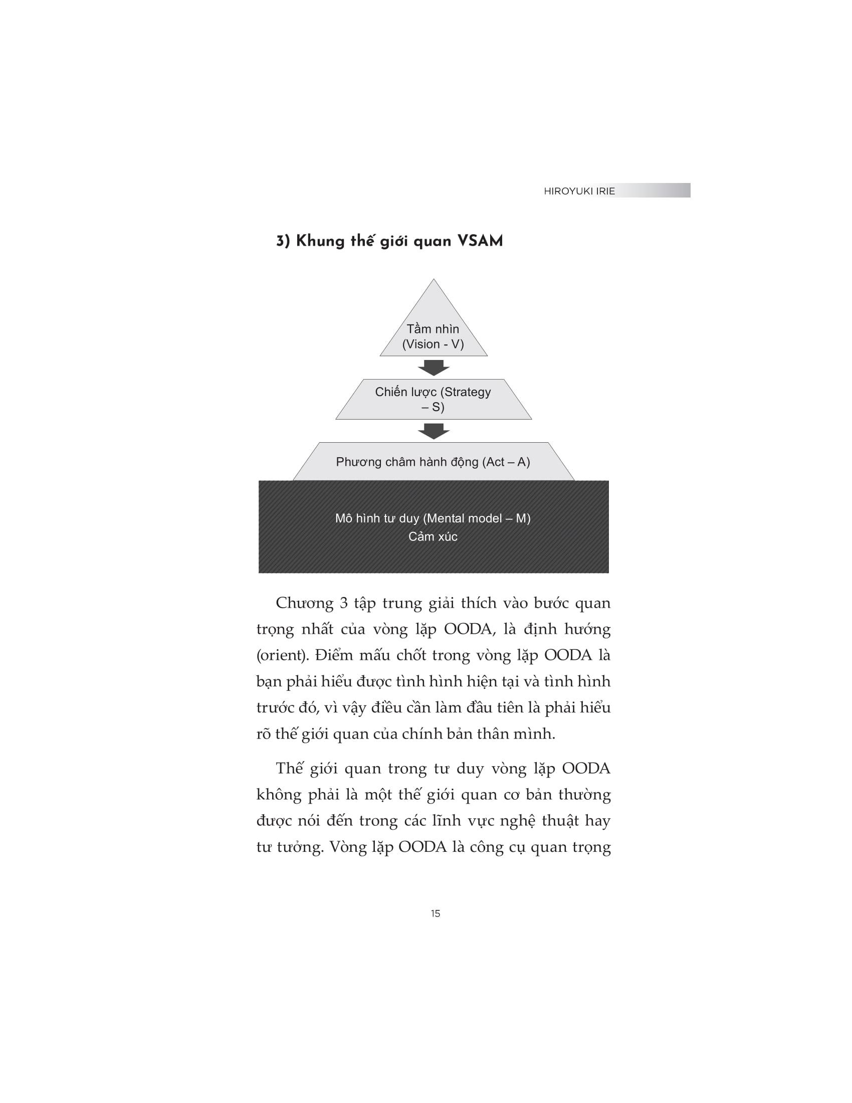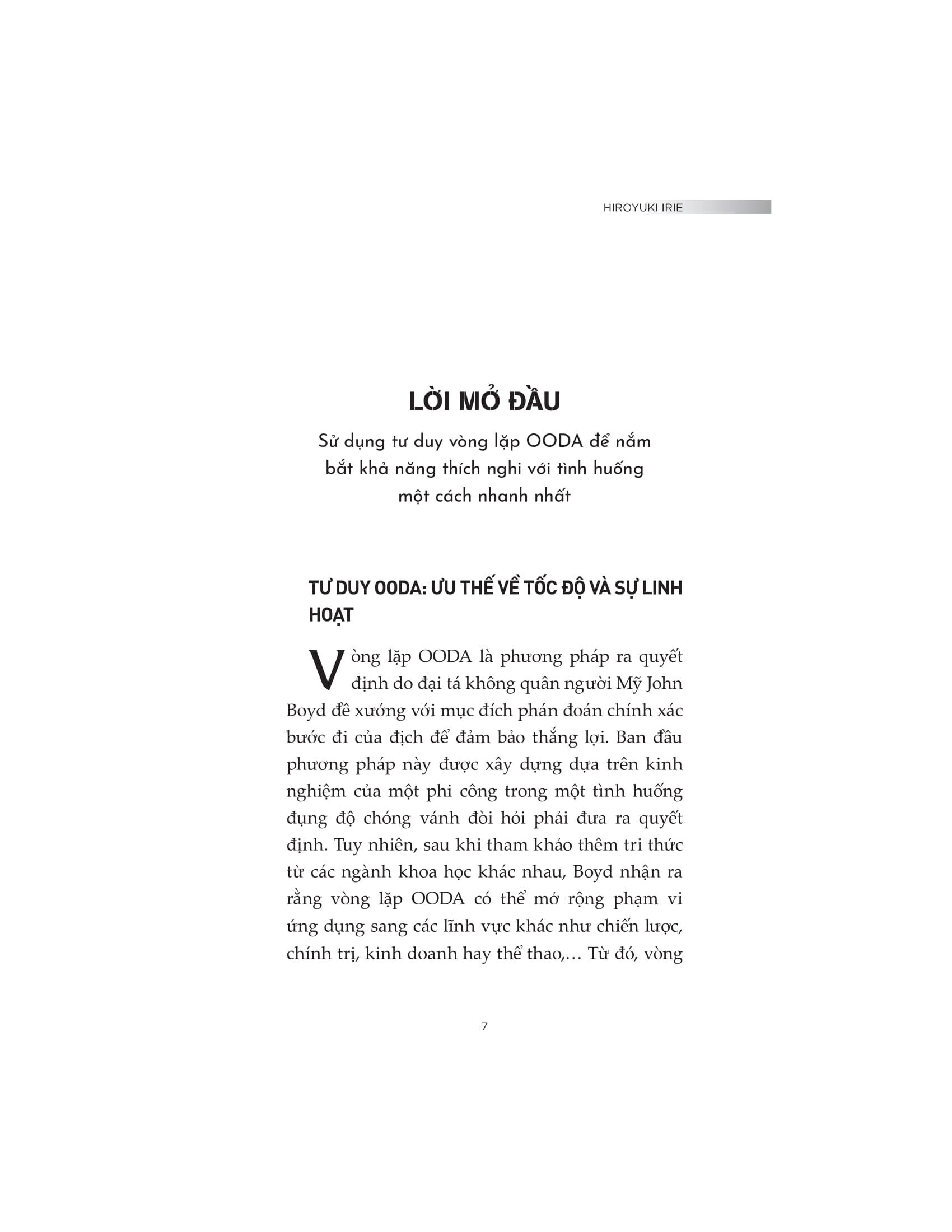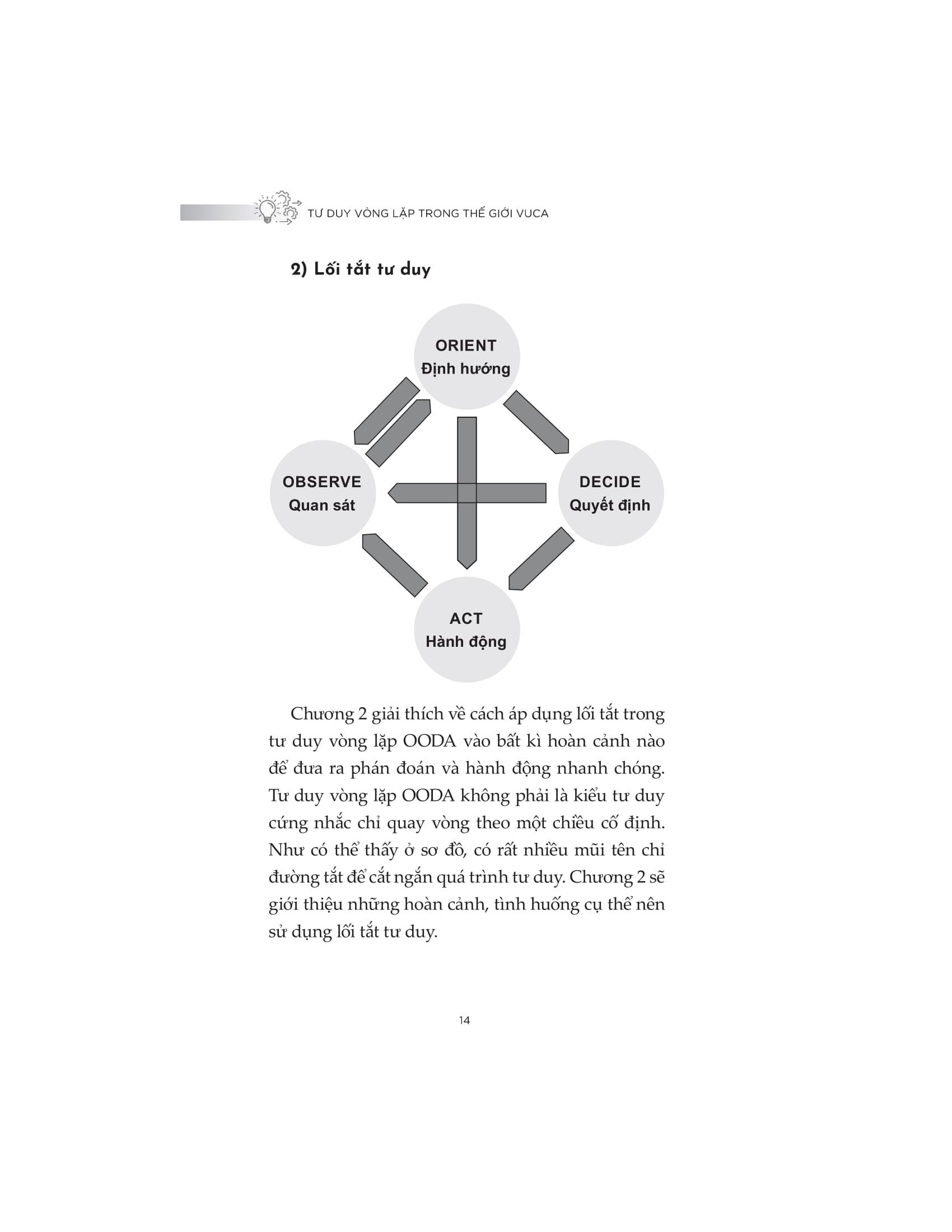 Tư Duy Vòng Lặp Trong Thế Giới VUCA Chúng ta đang sống trong một thời đại mà thông tin và tốc độ nắm quyền quyết định, cùng với sự phức tạp và khó nắm bắt của thế giới VUCA. Để có thể thích nghi và giành lợi thế trong bất kỳ môi trường nào thì tốc độ chính là yếu tố quyết định. Một trong những phương pháp tư duy ưu tiên tốc độ và tính linh hoạt hiệu quả hiện nay, đó là vòng lặp OODA. Vòng lặp OODA là một chu trình ra quyết định bao gồm: Observe (quan sát), Orient (định hướng), Decide (quyết định) và Action (hành động). Đây là quy trình phán đoán và ra quyết định được áp dụng chủ yếu trong các chiến lược quân sự và sau này là các hoạt động kinh doanh hay lãnh đạo. Với OODA, bạn sẽ giành được ưu thế tuyệt đối về tốc độ và sự linh hoạt để giải quyết các tình huống phát sinh trong công việc cũng như cuộc sống hằng ngày. Vòng lặp OODA đã được công nhận ở Âu Mỹ là phương pháp tư duy hiệu quả để đạt được mục đích nhanh chóng bằng phán đoán và ra quyết định chính xác dưới bất kỳ hoàn cảnh nào. Cuốn sách “Tư duy vòng lặp trong thế giới VUCA” hướng dẫn các “lối tắt” giúp ứng dụng vòng lặp OODA vào các tình huống thực tiễn một cách linh hoạt và hiệu quả, nó chắc chắn mang lại lợi ích đủ lớn để bạn từ bỏ lối tư duy thông thường của m.ình sang một lối tư duy "thần tốc" hơn. Thông qua những câu chuyện thực tế đi kèm nhiều ví dụ minh họa, bạn sẽ hiểu rõ việc áp dụng tư duy vòng lặp OODA vào bối cảnh công việc để đánh giá tình huống, nhìn nhận vấn đề, ra quyết định và hành động nhanh chóng. Bên cạnh đó, cuốn sách còn mang đến một góc nhìn mới về định nghĩa thế giới quan bằng khung tư duy VSAM, bao gồm : Tầm nhìn (Vision), Chiến lược (Strategy), Phương châm hành động (Activities Direction) và Mô hình tư duy (Mental Model).