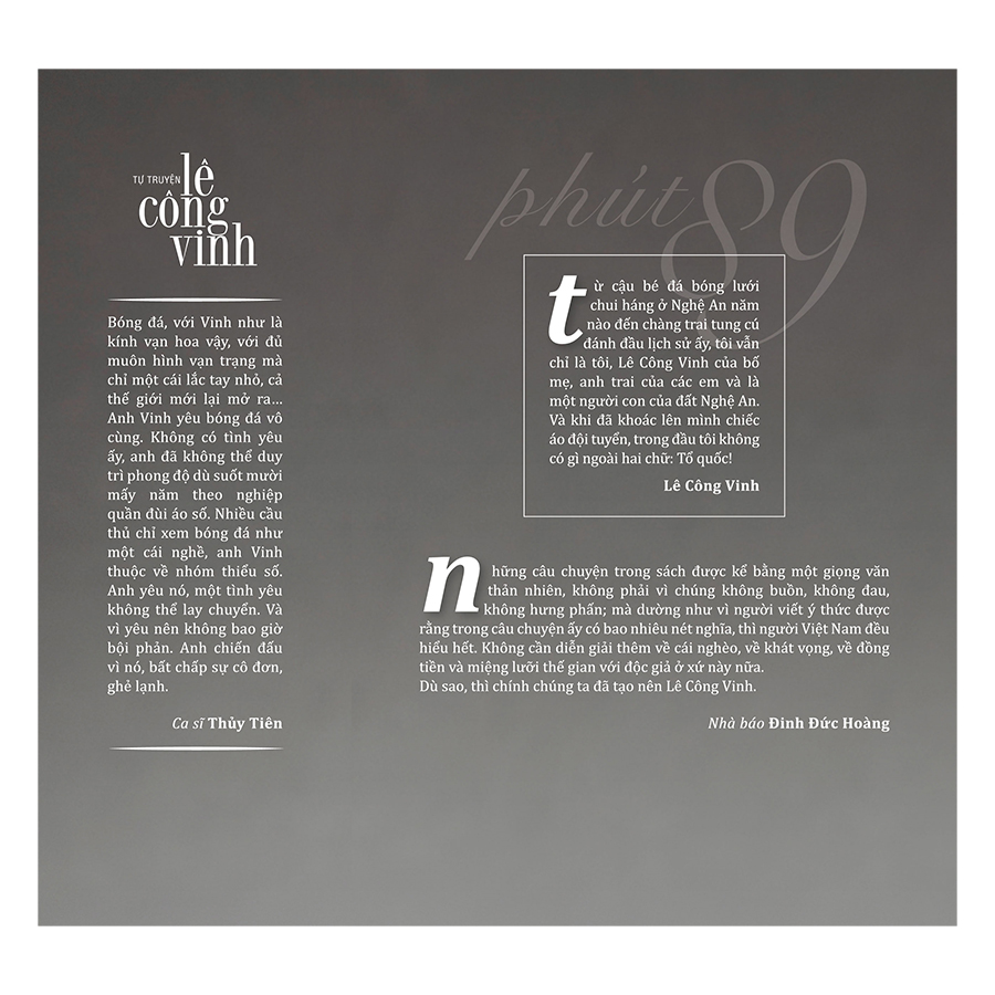 Từ một cậu bé đá bóng lưới chui háng ở Nghệ An năm nào đến chàng đến chàng trai tung đánh đầu lịch sử ấy, tôi vẫn chỉ là tôi, Lê Công Vinh của bố mẹ, anh trai của các em và là một người con của đất Nghệ An. Và khi đã khoác lên mình chiếc áo đội tuyển, trong đầu tôi không có gì ngoài hai chữ : Tổ Quốc ! – Lê Công Vinh