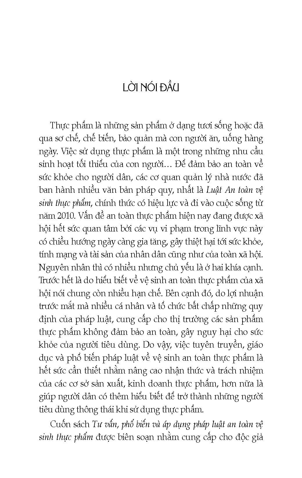 Cuốn sách Tư vấn, phổ biến và áp dụng pháp luật an toàn vệ sinh thực phẩm được biên soạn nhằm cung cấp cho độc giả những kiến thức cơ bản nhất về pháp luật vệ sinh an toàn thực phẩm, từ định nghĩa các loại thực phẩm cho đến trách nhiệm của các chủ thể trong việc đảm bảo an toàn vệ sinh thực phẩm cùng các khung pháp lý hiện hành theo quy định của pháp luật Việt Nam.