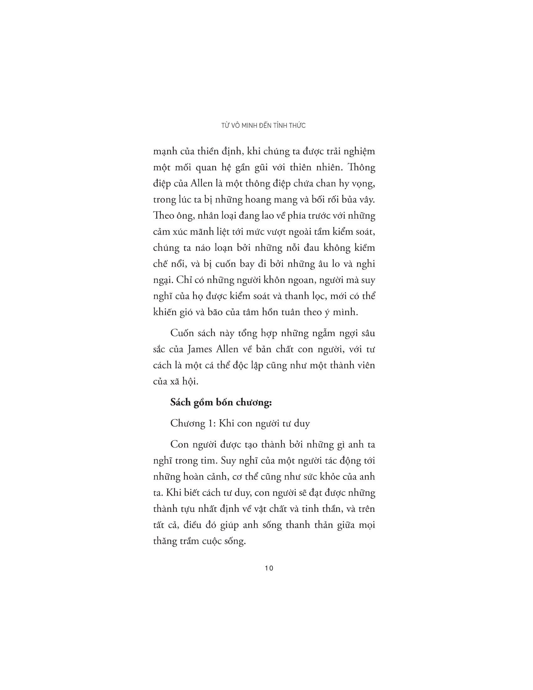 As a man thinketh – Từ vô minh đến tỉnh thức là tuyển tập những tác phẩm nổi tiếng nhất của triết gia thiên tài người Anh – James Allen. Cuốn sách này là những dòng suy ngẫm của tác giả về bản chất con người, với tư cách là một cá thể độc lập cũng như một thành viên của xã hội. Thế giới bên ngoài, rực rỡ, đẹp đẽ hay tăm tối xấu xa, hoàn toàn phụ thuộc vào cách ta nuôi dưỡng thế giới nội tâm của m.ình. Trong hành trình vun xới cho khu vườn tâm trí ấy, liệu ta có biếng lười mà thả m.ình theo những cám dỗ ngọt ngào hiểm ác, hay sẽ can đảm lựa chọn một con đường dẫu gian lao nhưng lương thiện, trong sáng và được ban phước lành?