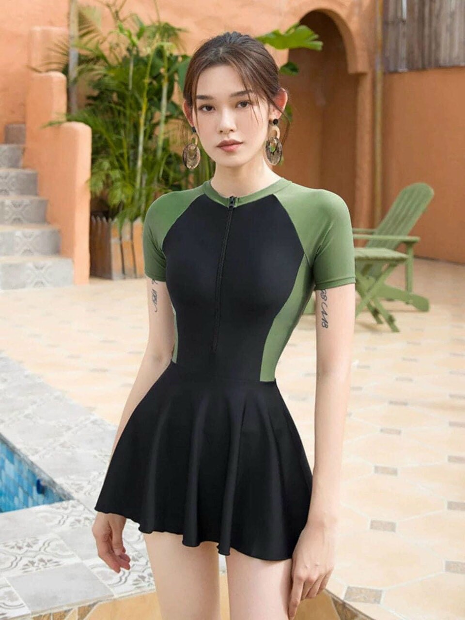 - Mẫu đồ bơi kín đáo với áo dài tay + quần short lửng, chống nắng tốt mà vẫn tôn dáng cho các bác tuổi trung niên. - Thiết kế 3 chi tiết với 2