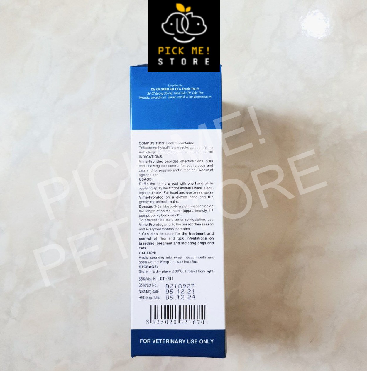 Vemedim Vime - Frondog 250ml | Xịt Ve Rận Bọ Chét Cho Chó Mèo Khử Khuẩn Chuồng Nuôi CÁCH DÙNG Vạch ngược lông, xịt vào da ở những vùng ve, rận, bọ chét thường lưu trú. Tuỳ thuộc vào độ dài của lông sử dụng 3-6 ml/kg trọng lượng (tương đương 4-7 lần bơm xịt/kg trọng lượng). Phòng ngừa 3 tháng sử dụng 1 lần. Trường hợp nguy cơ cao có thể sử dụng mỗi tháng 1 lần. Xử lý ấu trùng, trứng ve, bọ chét khu vực CHUỒNG NUÔI chó, mèo; côn trùng, mối, mọt, kiến, gián: