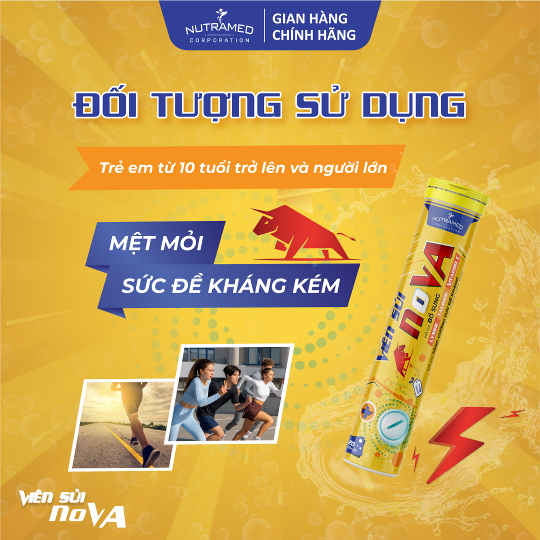 VIÊN SỦI N.O.V.A - Giải pháp hỗ trợ tăng cường sức đề kháng, giảm căng thẳng, mệt mỏi.   THÀNH PHẦN ️Taurine; Vitamin C (Acid L-ascorbic); Lysine hydrochloride, Caffeine; Vitamin B3 (Nicotinamide); Vitamin B1 (Thiamin hydrochloride); Vitamin B2 (Riboflavin sodium phosphate); Vitamin B6 (Pyridoxin hydrochloride); Vitamin B5 (D-Calcium pantothenate)   CÔNG DỤNG ️Tăng cường sức đề kháng và giảm mệt mỏi    ĐỐI TƯỢNG SỬ DỤNG ️Trẻ em từ 10 tuổi trở lên và người lớn mới mệt mỏi, sức đề kháng kém.   HƯỚNG DẪN SỬ DỤNG:  ️Cho 1 viên sủi vào 200ml nước sôi để nguội, chờ cho viên sủi tan hết rồi uống.  ️Trẻ em từ 10 tuổi trở lên: uống 1 viên/lần/ngày. ️Người lớn: uống 1 viên/lần x 2-3 lần/ngày. = > Uống sau ăn vào buổi sáng và trưa = > Ngon hơn khi uống lạnh   KHÔNG SỬ DỤNG TRONG CÁC TRƯỜNG HỢP ️Phụ nữ có thai, đang cho con bú. ️Người mẫn cảm với bất kỳ thành phần nào của thuốc. ️Người bị viêm thận, viêm loét dạ dày, tá tràng. ️Người bị bệnh tim mạch, huyết áp cao.   LƯU Ý ️Không sử dụng sản phẩm trước khi đi ngủ. ️Người đang dùng thuốc cần tham khảo ý kiến của chuyên gia. ️Không dùng quá liều khuyến nghị hàng ngày. ️Sản phẩm này không phải là thuốc và không có tác dụng thay thế thuốc chữa bệnh   BẢO QUẢN ️Để nơi khô ráo, nhiệt độ dưới 30°C tránh ánh nắng mặt trời ️Để xa tầm tay trẻ em   THÔNG TIN SẢN PHẨM Tên sản phẩm: Viên sủi N.o.v.a Quy cách đóng gói: Tuýp 20 viên Hạn sử dụng: 36 tháng kể từ ngày sản xuất. Tiêu chuẩn: TCCS.   Nutramed - Khơi Nguồn Khoa Học Tới Cuộc Sống Nhà máy đạt chuẩn WHO – GMP, nguyên liệu kiểm tra chất lượng nghiêm ngặt, đảm bảo an toàn và hiệu quả.