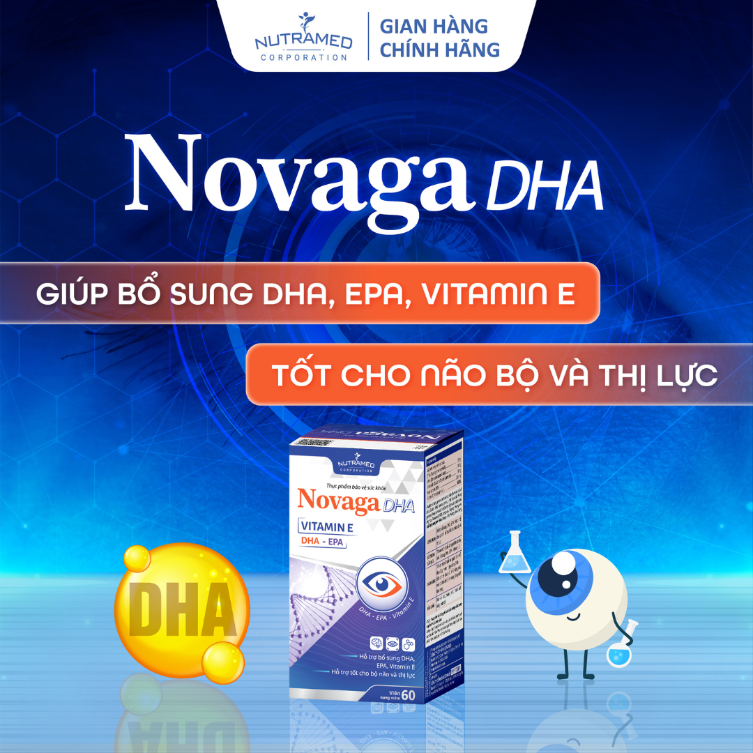 NOVAGA DHA - GIÚP BỔ SUNG DHA, EPA, VITAMIN E.  TỐT CHO NÃO BỘ VÀ THỊ LỰC    THÀNH PHẦN  ️EPA (Eicosapentaenoic acid), DHA (Docosahexaenoic acid), Vitamin E (DL-alpha tocopheryl acetate), Beta-caroten (30%), Vitamin A (Retinyl palmitat). CÔNG DỤNG    ️Hỗ trợ bổ sung DHA, EPA, vitamin E cho cơ thể, hỗ trợ tốt cho não bộ và thị lực.   ĐỐI TƯỢNG SỬ DỤNG  ️Trẻ em trên 6 tuổi và người lớn có nhu cầu bổ sung DHA, EPA, vitamin E.   HƯỚNG DẪN SỬ DỤNG  ️  Trẻ em trên 6 tuổi và người lớn: mỗi lần uống 1 viên, ngày uống 2 lần.  ️  Đối với trẻ chưa đủ khả năng nhai nuốt có thể cắt bỏ vỏ nang dùng dịch bên trong.   KHÔNG SỬ DỤNG TRONG TRƯỜNG HỢP  ️  Người mẫn cảm, kiêng kỵ với bất kỳ thành phần nào của sản phẩm.   LƯU Ý  ️  Thực phẩm này không phải là thuốc, không có tác dụng thay thế thuốc chữa bệnh.   BẢO QUẢN   ️  Nơi khô ráo, thoáng mát, tránh ánh nắng mặt trời.   THÔNG TIN SẢN PHẨM Tên sản phẩm: NOVAGA DHA Quy cách đóng gói: Hộp 1 lọ 60 viên Hạn sử dụng: 36 tháng kể từ ngày sản xuất. Tiêu chuẩn: TCCS   _ NUTRAMED - KHƠI NGUỒN KHOA HỌC TỚI CUỘC SỐNG   Nhà máy đạt chuẩn WHO – GMP. Nguyên liệu được kiểm tra chất lượng khắt khe bởi nhà máy đạt chuẩn GMP.