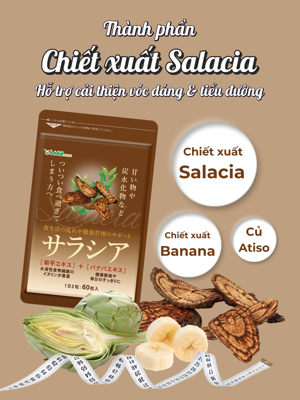 THÀNH PHẦN CỦA VIÊN UỐNG CHIẾT XUẤT SALACIA: Bột cây keo Ấn Độ Salacia (sản xuất trong nước), si rô tinh bột maltose, bột tinh chất atiso Jerusalem, bột tinh chất bằng lăng nước/cellulose tinh thể, canxi stearate, silic dioxit hạt mịn, pullulan CÔNG DỤNG CỦA VIÊN UỐNG CHIẾT XUẤT SALACIA:
