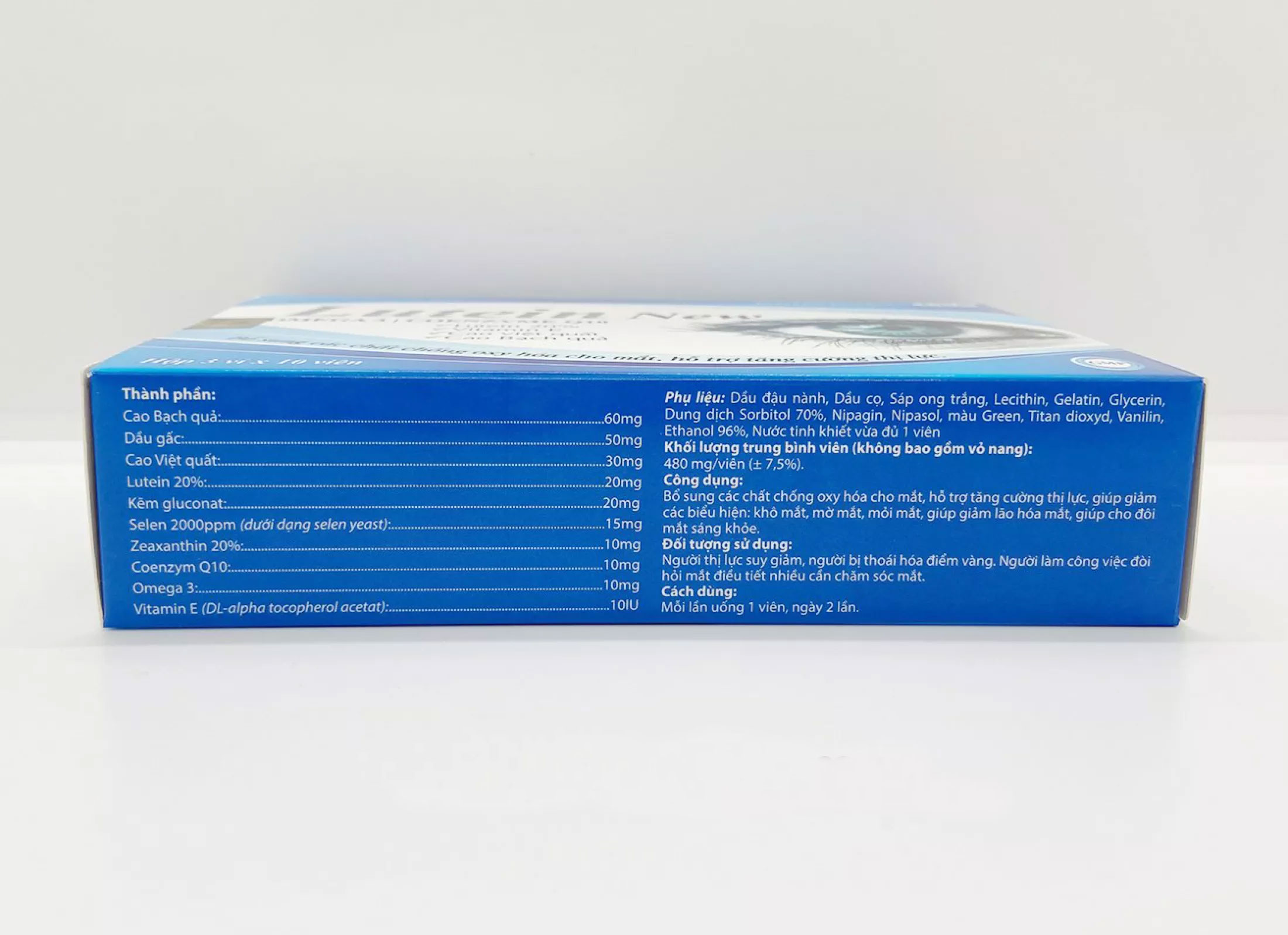 Viên uống bổ mắt LUTEIN NEW tăng cường thị lực – Hộp 30 viênTHÀNH PHẦN:Cao bạch quả: 60mgDầu gấc: 50mgCao việt quất: 30mgLutein 20%: 20mgKẽm gluconat : 20mgSelen 200ppm: 15mgZeaxanthin20%: 10mgCoezym...