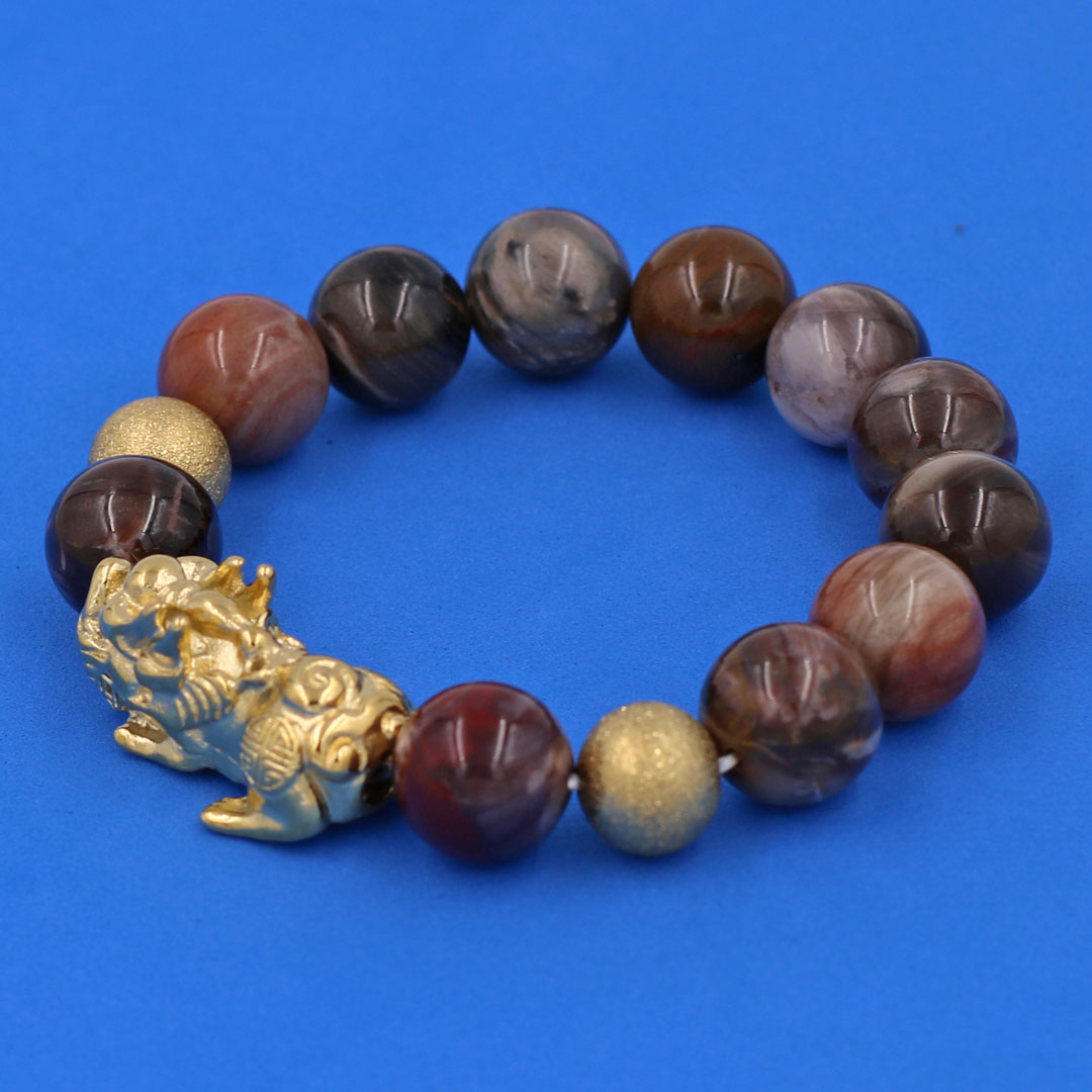 Thông tin sản phẩm : Vòng chuỗi đeo tay gỗ hóa thạch 14 ly ( size lớn ) charm tỳ hưu và bi inox, vòng tay chuỗi hạt