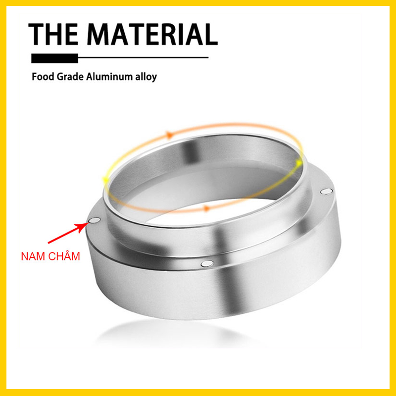 Vòng Đông Cà Phê Size 58; 53; 51mm - Dosing Funnel Vòng đong cà phê được lắp trên giỏ lọc trên tay pha Espresso. Vòng được thiết kế với tác dụng ngăn bột cà phê xay không bị đổ ra ngoài trong quá trình cho cà phê vào phễu lọc Sản phẩm được làm bằng nhôm rất an toàn. Bạn có thể vệ sinh phễu dễ dàng bằng nước