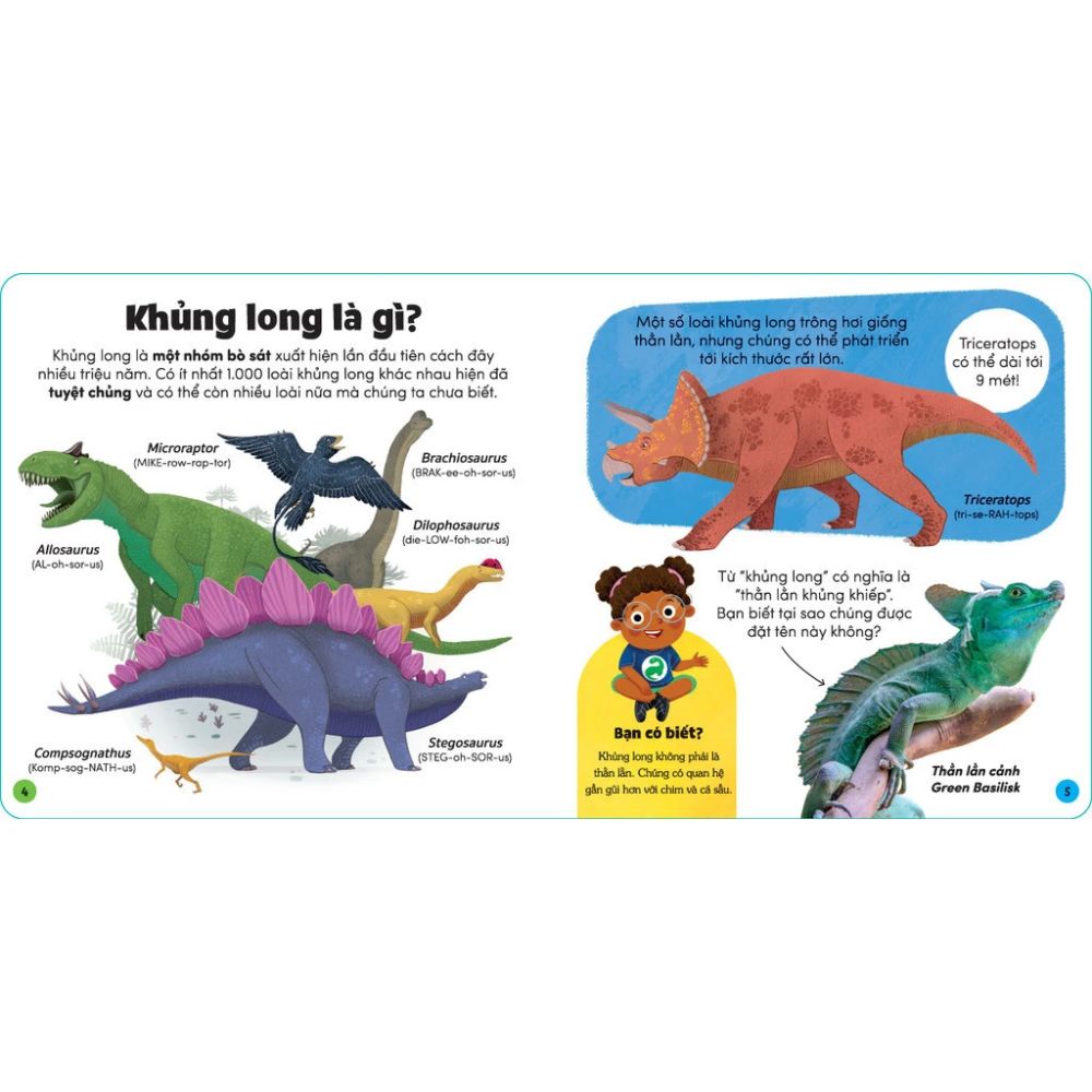 Đối với các độc giả nhí vẫn luôn tò mò về thế giới đầy bí ẩn của những chú khủng long, cuốn sách thú vị này sẽ không làm các bé thất vọng. Cuốn sách giới thiệu mọi thứ từ khủng long sống trong giai đoạn nào, chúng trông như thế nào, chúng ăn gì đến vì sao khủng long lại tuyệt chủng. Phụ huynh hãy cùng bé mở sách và giải đáp những thắc mắc của con trẻ nào!