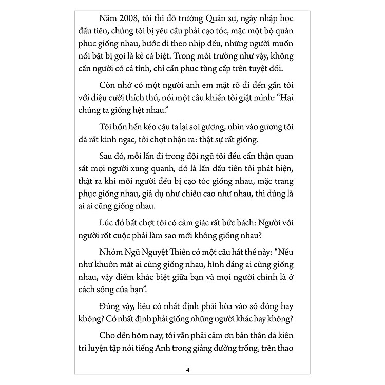 Đúng vậy, liệu có nhất định phải hòa vào số đông hay không? Có nhất định phải giống những người khác hay không? Cho đến hôm nay, tôi vẫn phải cảm ơn bản thân đã kiên trì luyện tập nói tiếng Anh trong giảng đường trống, trên thao trường và ngay ở một góc không bóng người, thời gian tám tháng khắc cốt ghi tâm đó đã khiến tôi thay da đổi thịt.