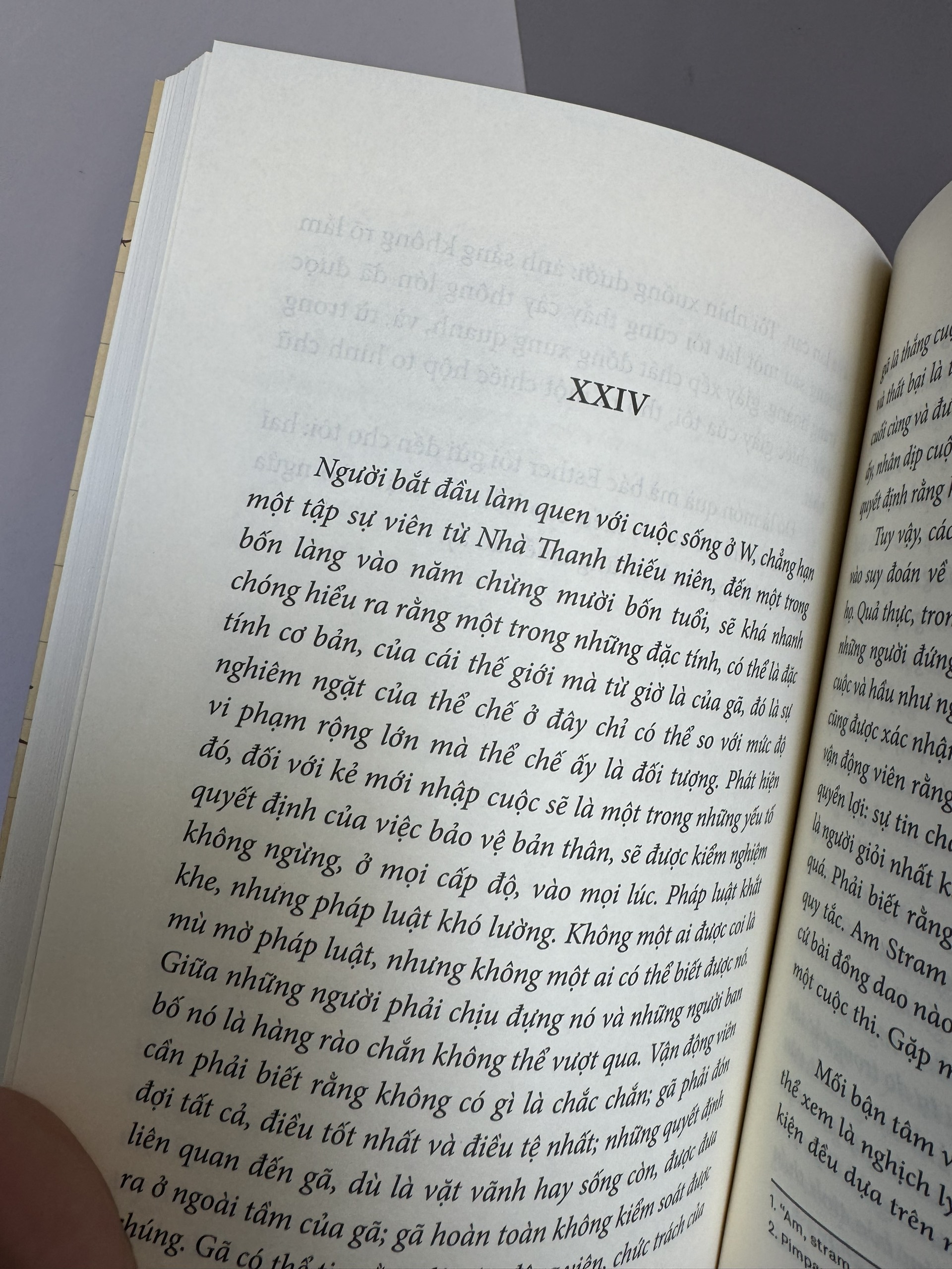 Một trong hai văn bản đó hoàn toàn là tưởng tượng: đó là một tiểu thuyết phiêu lưu, là sự tái tạo, võ đoán nhưng tỉ mỉ, về một mộng tưởng trẻ thờ gợi đến một thành phố nơi ý tưởng Olympic ngự trị. Văn bản còn lại là một bản tự truyện: câu chuyện tản mát về cuộc đời một đứa trẻ thời chiến, một câu chuyện chẳng có mấy chiến tích lẫn kỷ niệm, được tạo nên từ những mẩu rời rác, những sự thiếu vắng, những quên lãng, những nghi hoặc, những giả thuyết, những giai thoại nghèo nàn. Bên cạnh đó, phần truyện phiêu lưu có gì đó kỳ vĩ, hay có lẽ là đáng ngờ. Vì nó bắt đầu kể một câu chuyện, rồi đùng một cái, chuyển sang một câu chuyện khác: trong sự gián đoạn này, cái sự đứt đoạn ngắt lưng chừng câu chuyện mà người ta không biết có sự chờ đợi nào xoay quanh nó, xuất hiện nơi chốn đầu tiên cuốn sách này ra đời, những điểm treo ấy được những sợi dây đã bị cắt lìa khỏi tuổi thơ và cái nền của bản viết níu vào." - Georges Perec