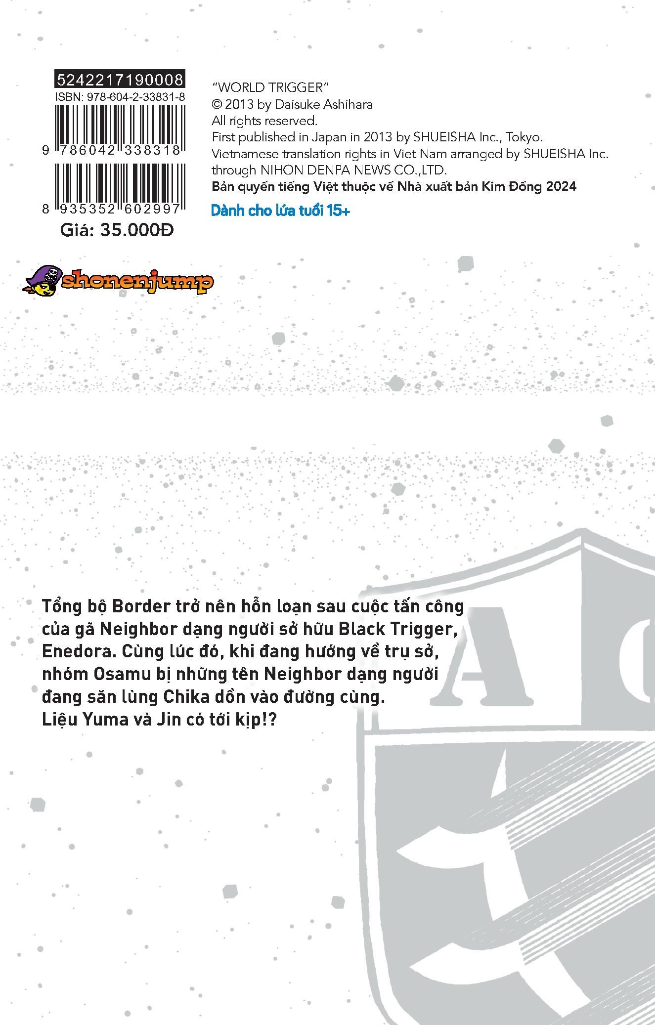 World Trigger - Tập 8 Tổng bộ trở nên hỗn loạn sau cuộc tấn công của gã Neighbor dạng người sở hữu Black Trigger, Enedora. Cùng lúc đó, khi đang hướng về trụ sở, nhóm Osamu bị những tên Neighbor dạng người đang săn lùng Chika dồn vào đường cùng. Liệu Yuma và Jin có tới kịp!?