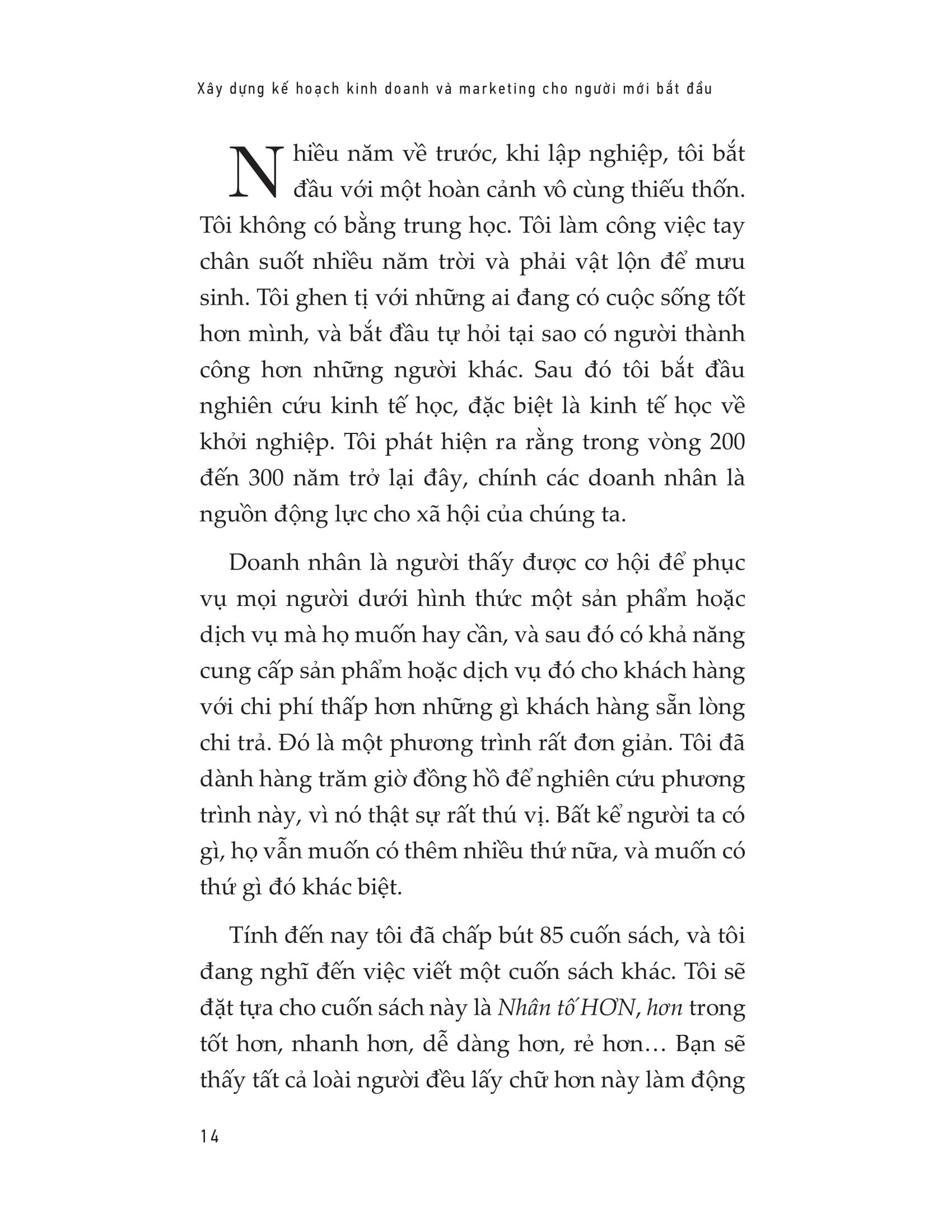 Việc bạn có trở nên giàu có hay không phụ thuộc vào chính những nỗ lực của bản thân bạn, bằng cách xác định chính xác bạn muốn gì, viết những điều đó ra, lập kế hoạch, bắt tay vào thực hiện và theo đuổi chúng cho đến khi bạn thành công. « Xây dựng kế hoạch kinh doanh và marketing cho người mới bắt đầu » sẽ giúp bạn có được cái nhìn sâu sắc nhất về thành công cá nhân, giàu có, hạnh phúc và viên mãn. Hãy quyết định chính xác điều bạn muốn là gì rồi bắt đầu, và không bao giờ bỏ cuộc cho đến khi thành công.