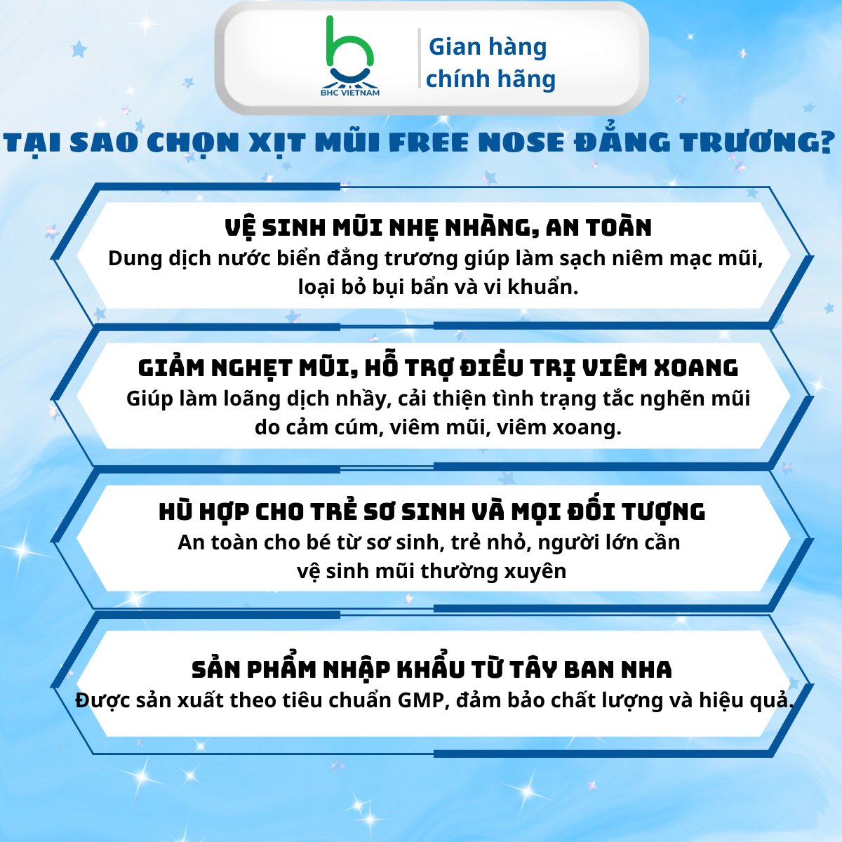 Xịt Mũi Free Nose Đẳng Trương Vệ Sinh Mũi Hằng Ngày Dành Cho Trẻ Sơ Sinh Tên sản phẩm: Free Nose Đẳng Trương Dạng bào chế: Dung dịch xịt mũi Quy cách đóng gói: Chai 120 ml Xuất xứ: Tây Ban Nha Hạn sử dụng: 36 tháng Tiêu chuẩn: TCCS, GMP Công Dụng Nổi Bật: Vệ sinh mũi hằng ngày giúp làm sạch niêm mạc mũi, hỗ trợ điều trị các vấn đề về mũi. Hỗ trợ điều trị viêm mũi họng, viêm xoang, và viêm mũi tắc nghẽn. Giảm tình trạng khô mũi, khàn tiếng do niêm mạc mũi bị khô. Phù hợp với các bệnh lý liên quan đến tai mũi họng và khoa Nhi. Thành Phần Chính: Nước biển đẳng trương (Natri clorid 0,9%) kết hợp với nước tinh khiết giúp vệ sinh mũi hiệu quả, làm loãng dịch nhầy và giảm tắc nghẽn. Đối Tượng Sử Dụng: Trẻ sơ sinh, trẻ em, và người lớn cần vệ sinh mũi hoặc hỗ trợ điều trị các bệnh lý về mũi, xoang, tai mũi họng. Hướng Dẫn Sử Dụng: Xịt vào mỗi bên mũi theo hướng dẫn sử dụng. Có thể sử dụng hàng ngày để hỗ trợ vệ sinh mũi và giảm các triệu chứng nghẹt mũi. Lưu Ý Khi Sử Dụng: ️ Để xa tầm tay trẻ em. ️ Sản phẩm này không phải là thuốc và không có tác dụng thay thế thuốc chữa bệnh. Vì sao nên chọn Xịt Mũi Free Nose Đẳng Trương? Vệ sinh mũi nhẹ nhàng, an toàn: Dung dịch nước biển đẳng trương giúp làm sạch niêm mạc mũi, loại bỏ bụi bẩn và vi khuẩn. Giảm nghẹt mũi, hỗ trợ điều trị viêm xoang: Giúp làm loãng dịch nhầy, cải thiện tình trạng tắc nghẽn mũi do cảm cúm, viêm mũi, viêm xoang. Phù hợp cho trẻ sơ sinh và mọi đối tượng: An toàn cho bé từ sơ sinh, trẻ nhỏ, người lớn cần vệ sinh mũi thường xuyên. Sản phẩm nhập khẩu từ Tây Ban Nha: Được sản xuất theo tiêu chuẩn GMP, đảm bảo chất lượng và hiệu quả. FREE NOSE – Hỗ trợ bảo vệ đường hô hấp, giúp bé thở dễ dàng hơn! MUA NGAY Free Nose – Giải Pháp Vệ Sinh Mũi Hằng Ngày Cho Trẻ Sơ Sinh!