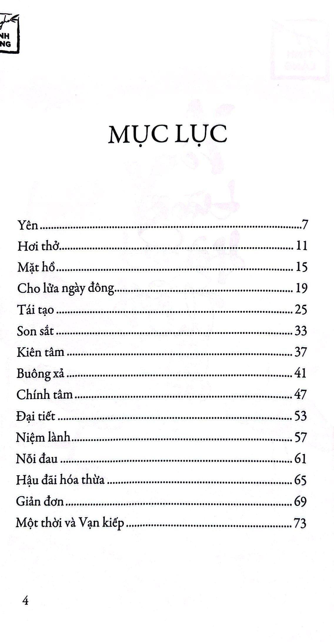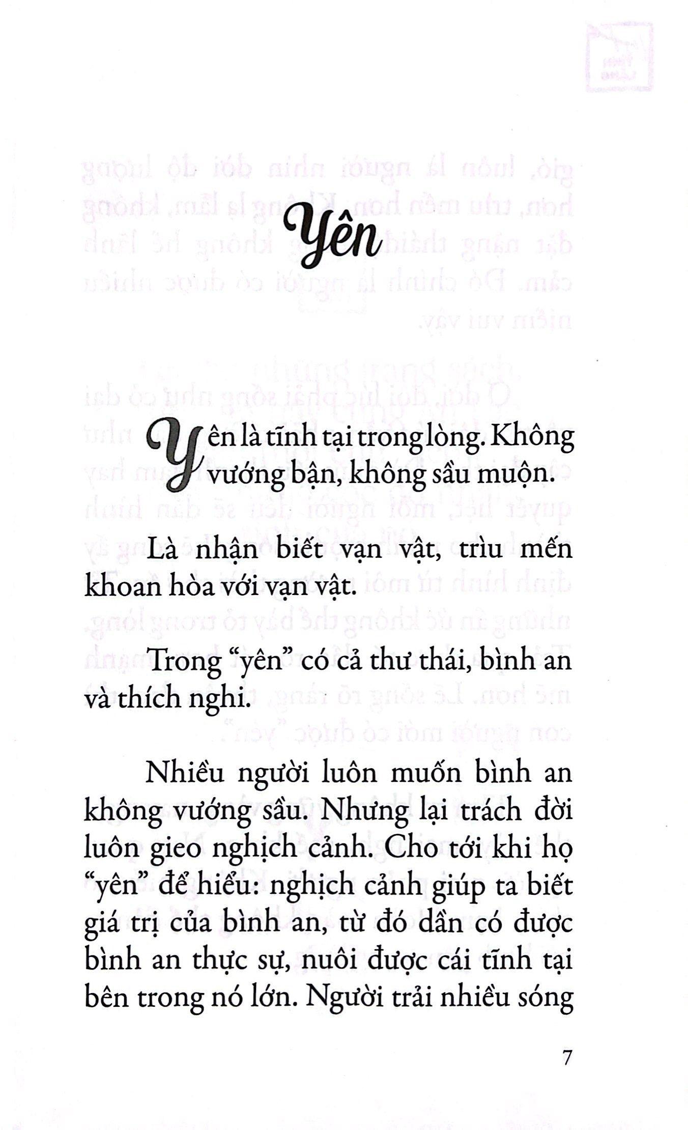“Yên là tĩnh tại trong lòng. Không vướng bận, không sầu muộn. Là nhận biết vạn vật, trìu mến khoan hòa với vạn vật. Trong “yên” có cả thư thái, bình an và thích nghi”. Chúng ta thường hờn trách thế giới, than khóc với trời xanh vì sao tệ bạc với số mệnh của m.ình khi rơi vào những hoàn cảnh ngặt nghèo, bất hạnh. Chúng ta ganh ghét, đố kị với những sinh mệnh may mắn và hạnh phúc hơn, trong khi chúng ta thì ngược lại. Lòng chúng ta mơ lớn, luôn muốn cuộc sống dễ dàng hơn với chính m.ình nhưng ta lại chưa từng yêu lấy thế giới. Tâm chưa đủ rộng, lòng chưa đủ dày và khoan dung với vạn vật thì hà cớ gì ai ai cũng mong cầu được thế giới đối xử nhẹ nhàng. Người ta thường nói, cách bạn nhìn nhận mọi thứ xung quanh sẽ quyết định chữ an, chữ yên trong tâm bạn. Vì thế, nếu bạn muốn lòng vẫn bình tâm, tĩnh lặng trước bão giông thì hãy mở rộng tâm hồn để đón nhận vạn vật trong sự chan hòa và yêu thương. “Yên từng hơi thở, chính là đi tìm và hiểu thế giới theo cách của thế giới. Là mỗi phút mỗi giây đều mở rộng tâm hồn. Vì mở rộng tâm hồn mà được ung dung. Vì biết cách nhìn, biết hiền từ mà mọi điều chảy vào tâm tư đều luôn nhẹ nhàng.” (Trích “Yên từng hơi thở”)